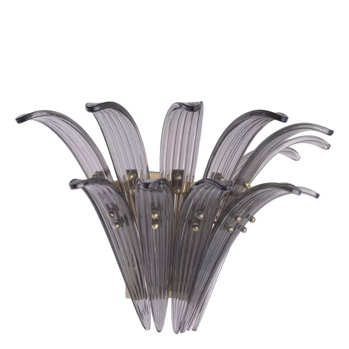Inspired by nature, Wall Lamp Italo creates a display of energetic brilliance and shadows. The luminaire has a light brushed brass finish and two rows of ribbed smoked glass decorations, reminiscent of leaves, giving the impression of a tropical treetop.