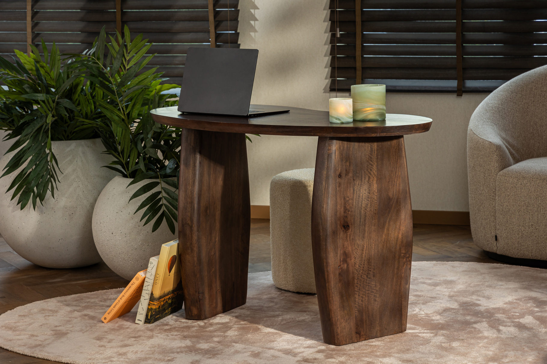 Le bureau MOZI de la marque de luxe Dôme Deco. Ce bureau s'impose dans n'importe quel bureau. Ses formes organiques font ressortir le bois de manguier foncé. Une belle pièce de design.