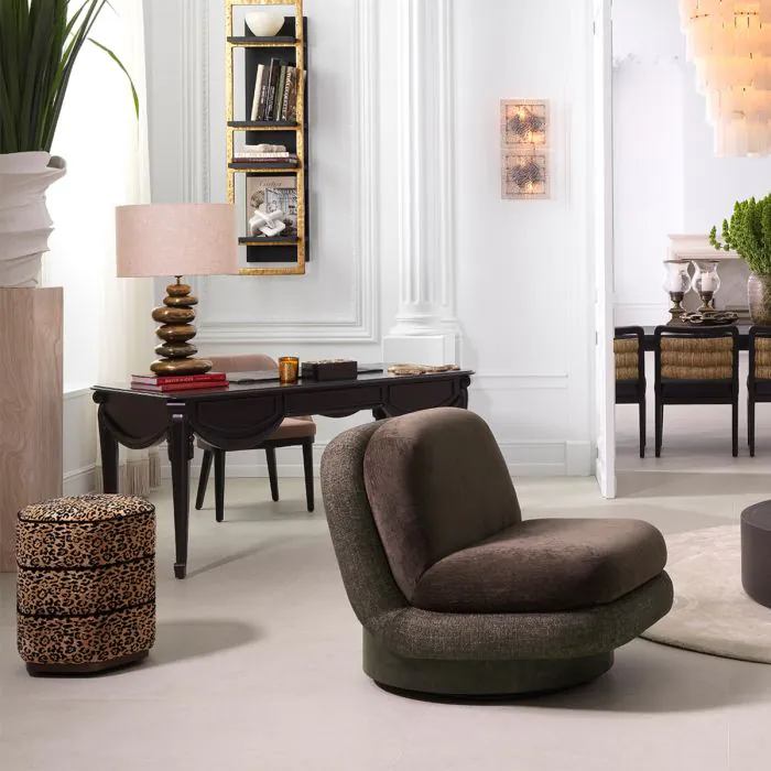 Rehaussez votre intérieur avec le fauteuil pivotant Galiano, qui allie les tissus Renato et Bayard brun foncé à un piètement pivotant raffiné en bois. Ce modèle harmonise les tons chauds de la terre et les formes contemporaines, offrant une expérience d'assise sophistiquée qui allie confort tactile et charme visuel.