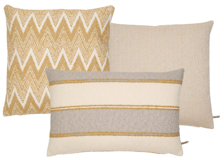 Belle combinaison de coussins d'extérieur de couleur Mustard de la marque néerlandaise CLAUDI. L'ensemble de coussins est disponible immédiatement et a un prix d'ensemble spécial.
