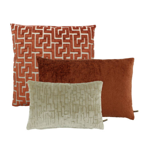Les combinaisons de coussins ont été composées avec soin et sont destinées à vous inspirer. Osez combiner avec différentes couleurs et imprimés à l'intérieur ! Cet ensemble se compose de coussins de couleurRust, chacun avec son propre imprimé. Le mélange de matériaux donne un aspect riche à ce magnifique ensemble de coussins.