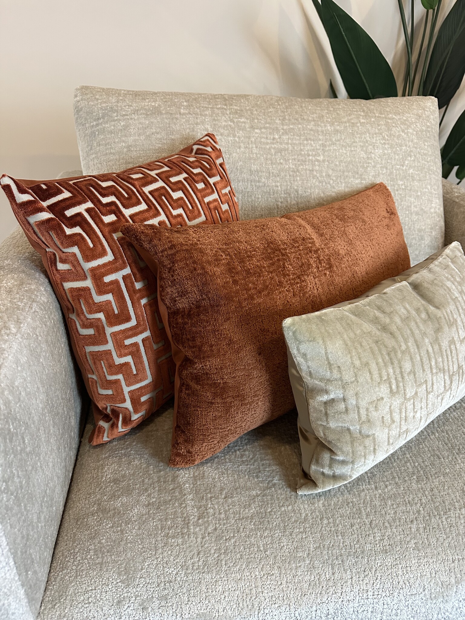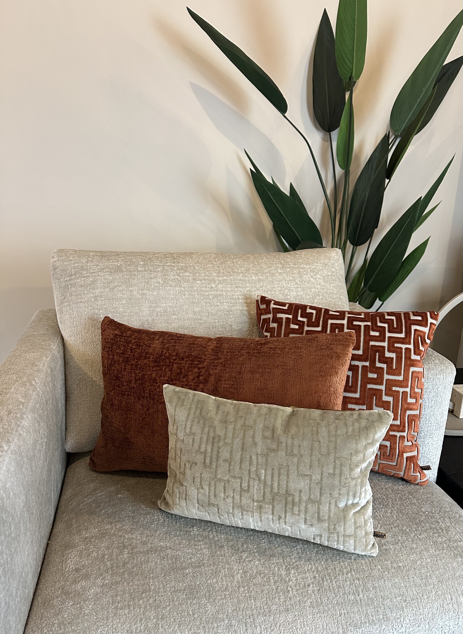 Belle combinaison de coussins de couleur Rust de la marque néerlandaise CLAUDI. L'ensemble de coussins est disponible immédiatement et a un prix spécial.