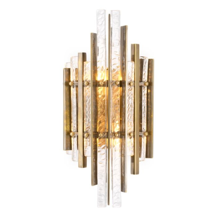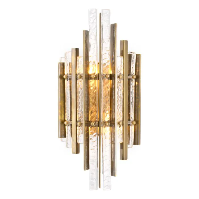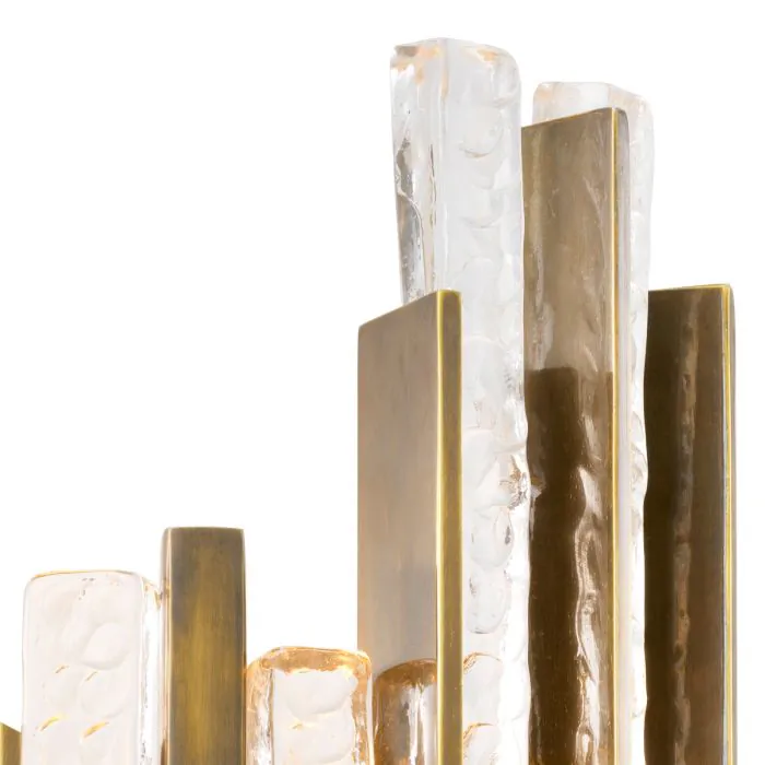 Illuminez votre espace avec le charme élégant de l'applique murale Leonora. Dotée de panneaux en verre faits main avec un motif découpé à la main et de barres en laiton vintage, cette applique murale respire la sophistication et le luxe moderne. Le verre texturé ajoute une profondeur subtile et un caractère artisanal, tandis que les barres en laiton rehaussent son charme intemporel.