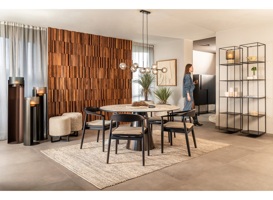 Découvrez la lampe suspendue IMURA de la marque belge Dôme Deco. La lampe suspendue est dotée d'un cadre en métal noir et de huit boules lumineuses en verre fumé. Imura est un complément parfait à toute salle à manger.