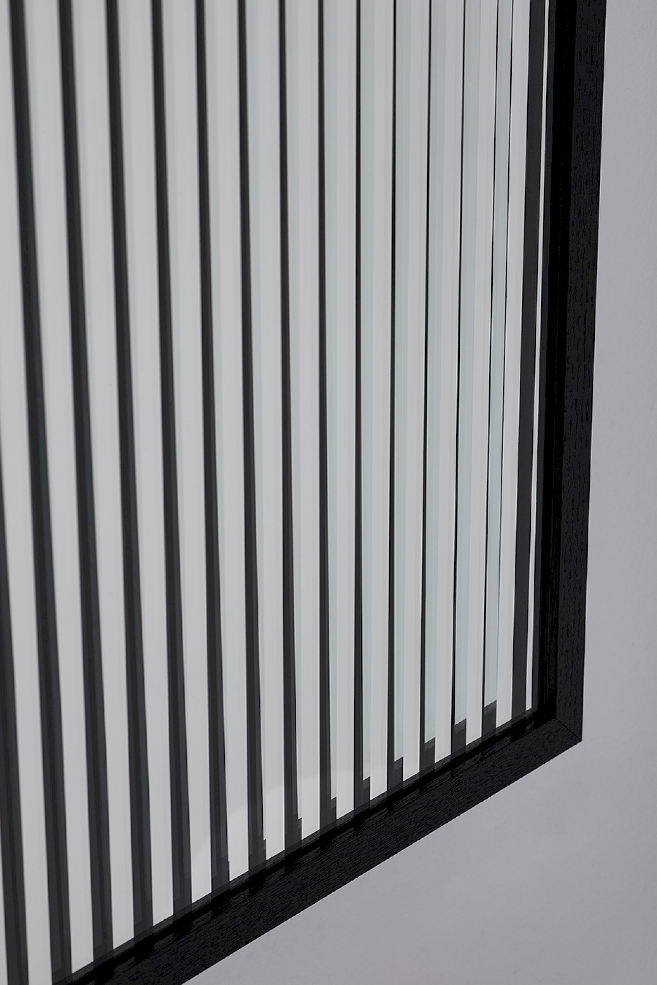 Verre partiellement transparent, imprimé et réfléchissant + cadre en chêne massif noir