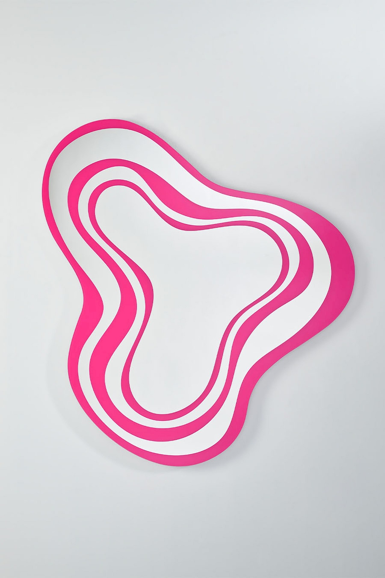 Le miroir 'Nimbus Pink' s'inspire de la beauté éphémère des nuages et de leur mouvement constant. Des bandes alternées de verre miroir et de verre teinté orange créent un rythme fluide qui rappelle les nuages flottants et évoque un effet visuel presque méditatif.