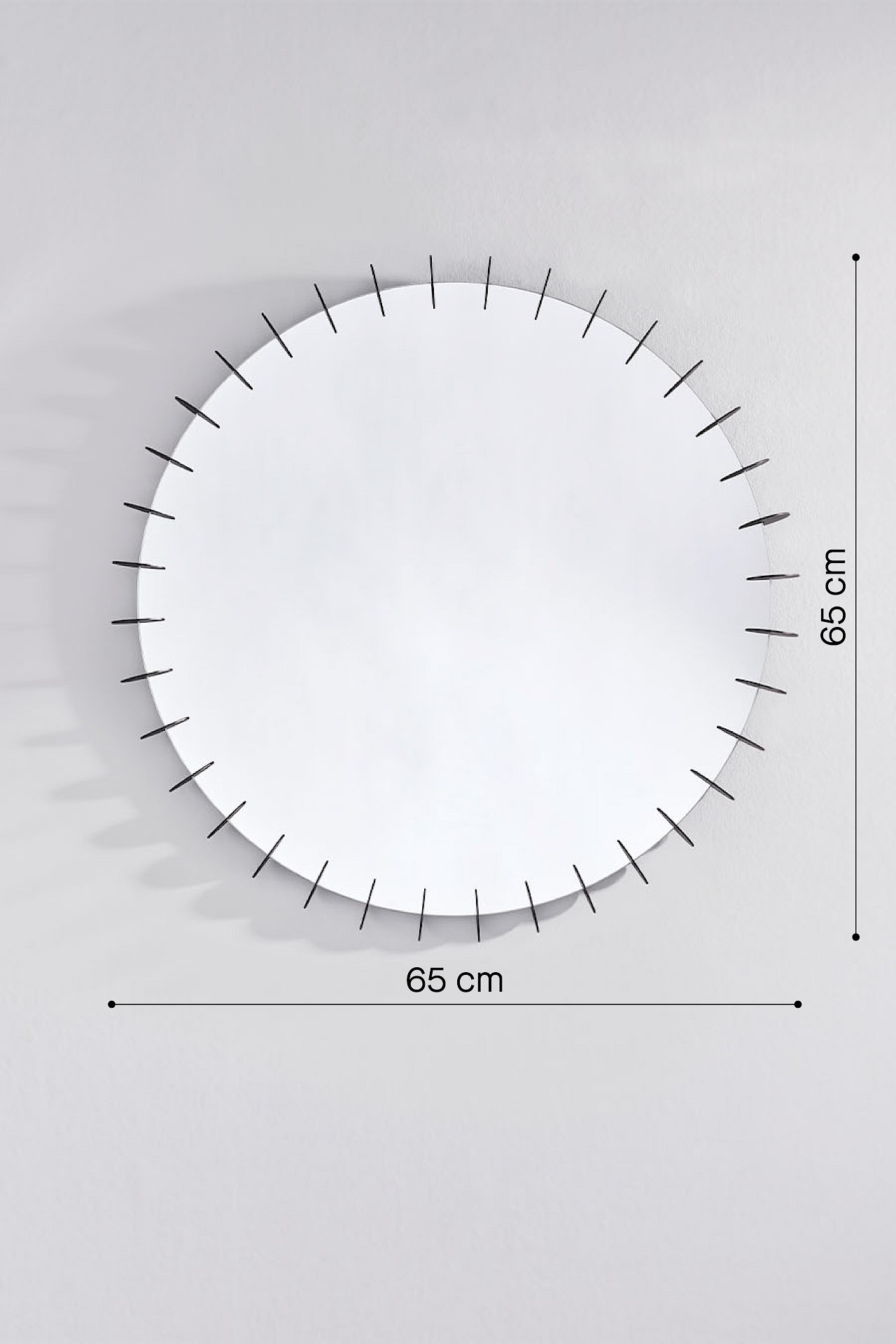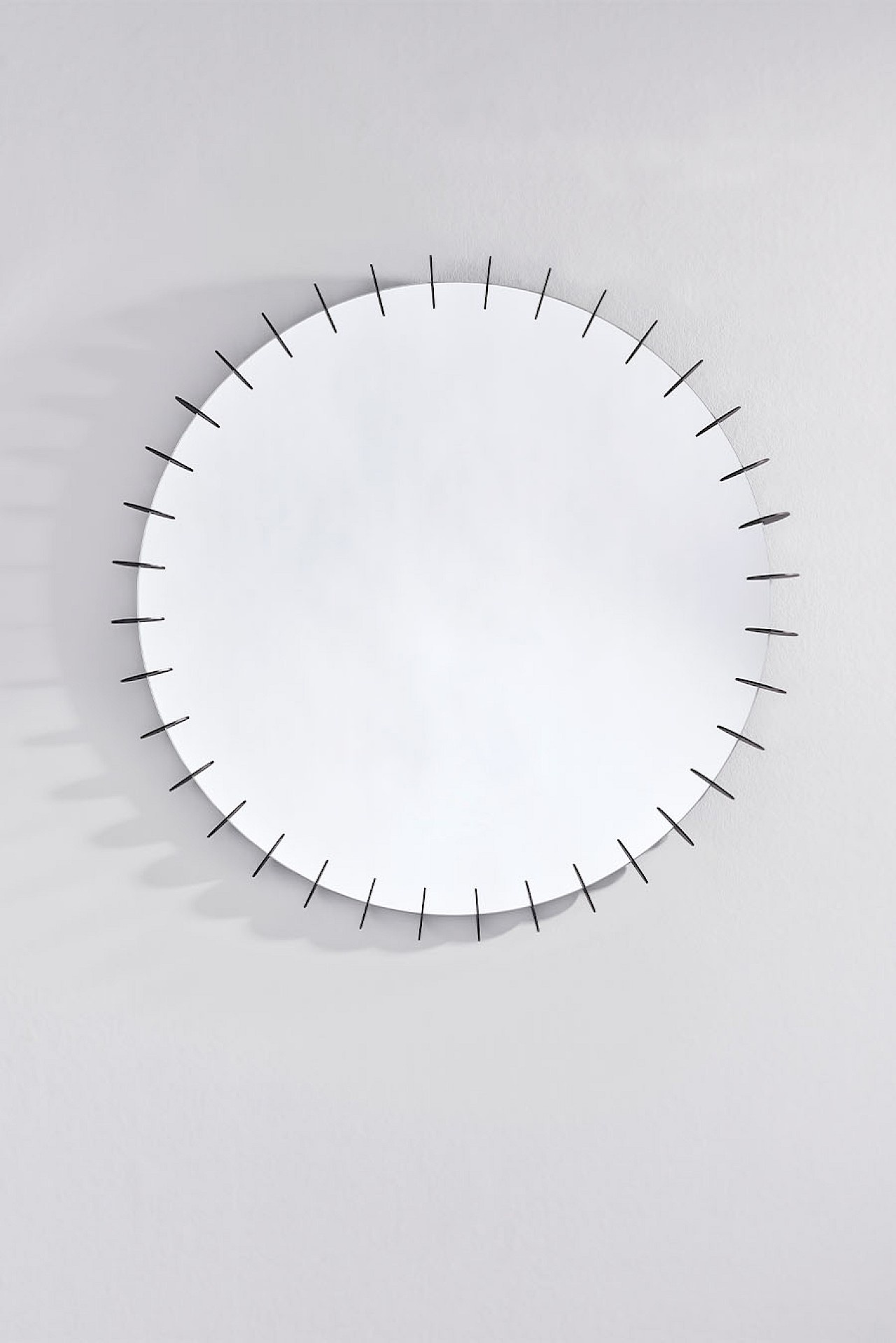 Le miroir 'Ray Black S' est un élégant miroir rond d'un diamètre de 65 cm, encadré par une série de petits disques métalliques qui l'entourent gracieusement. Ce bord particulier se prolonge visuellement dans le reflet, créant ainsi une illusion de continuité sans faille.