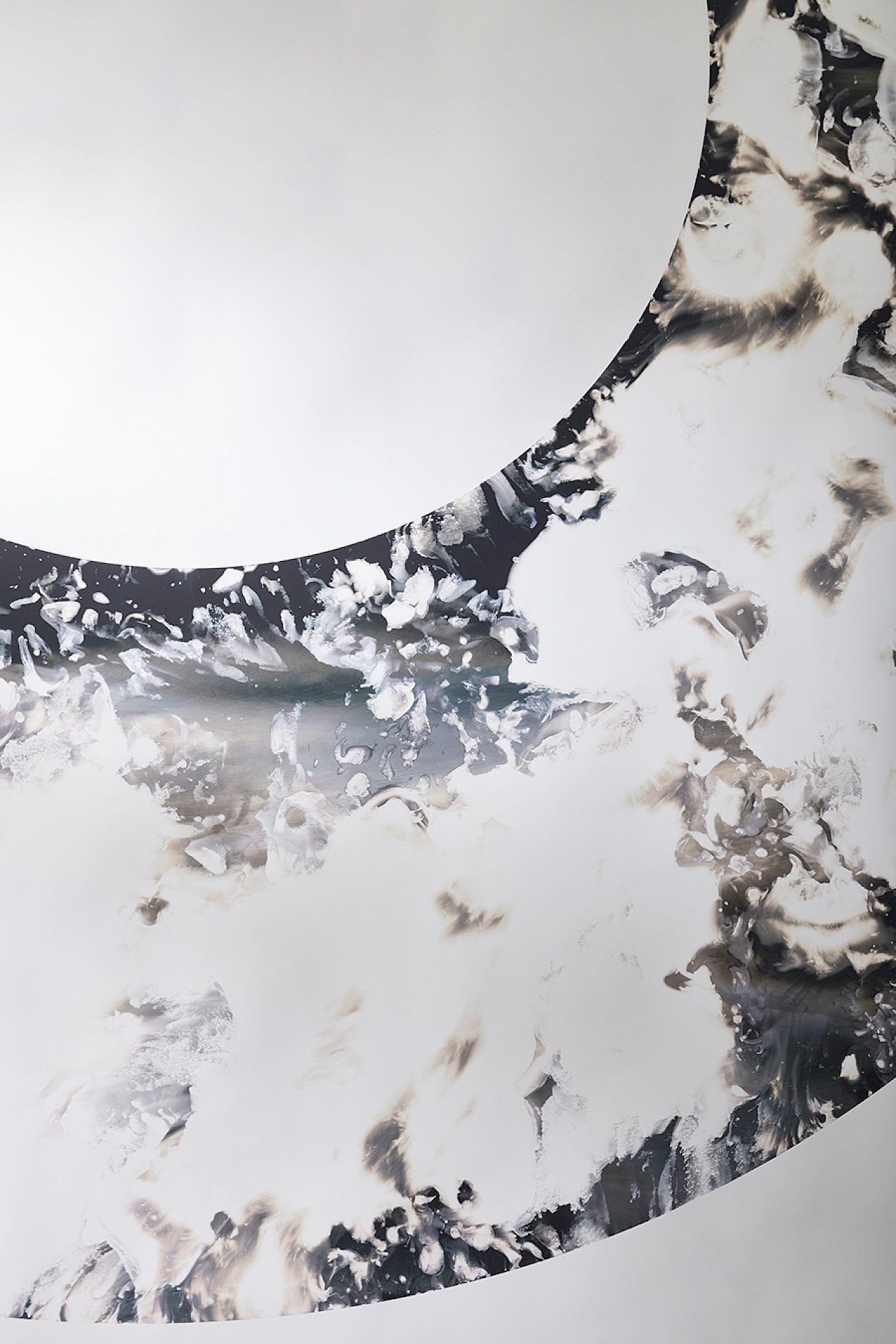 Les motifs organiques dans le verre contrastent magnifiquement avec la finition lisse et polie. Le processus de coulée artisanal crée des dessins complexes en noir, gris, argent et brun, comparables à la beauté capricieuse des nuages.
