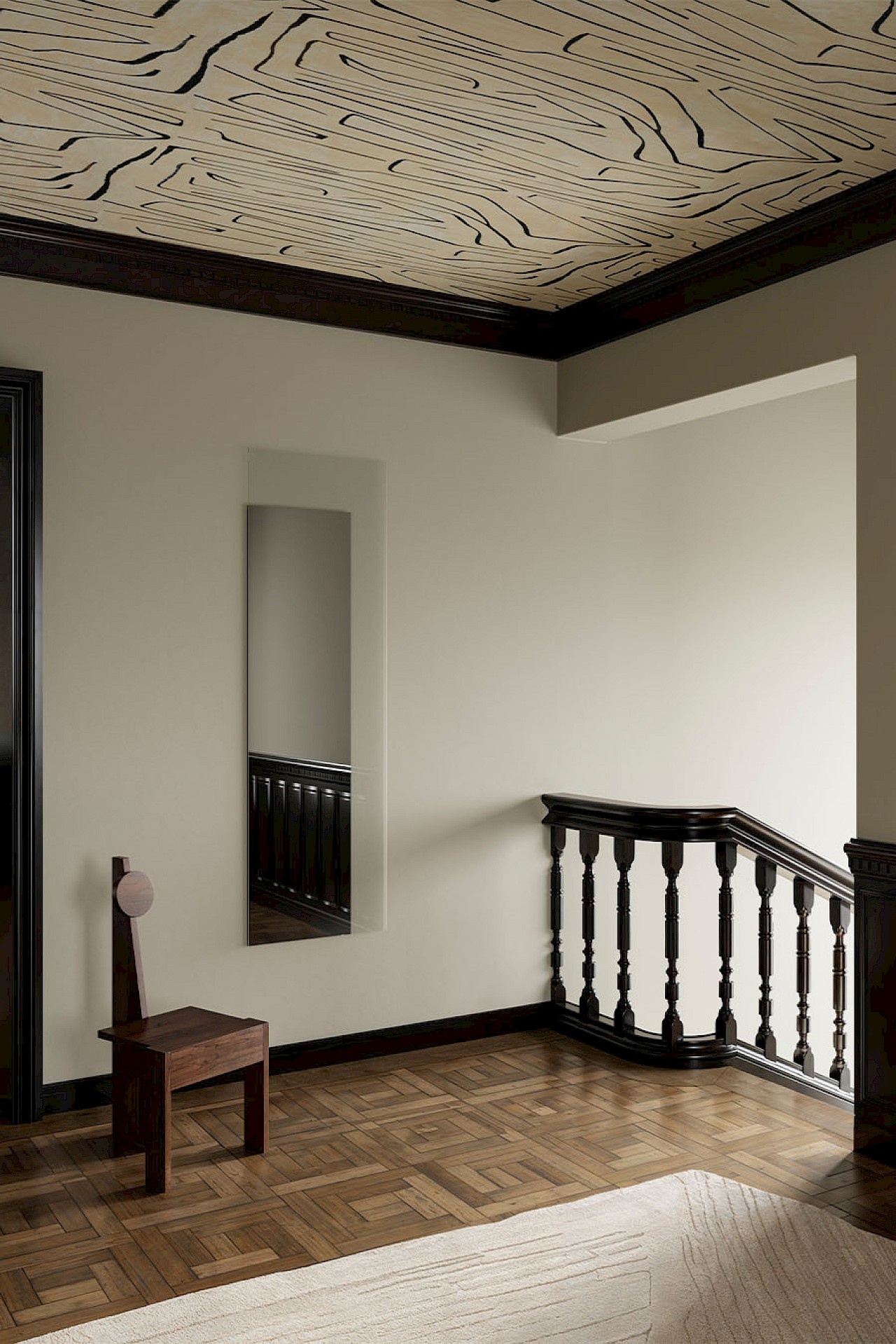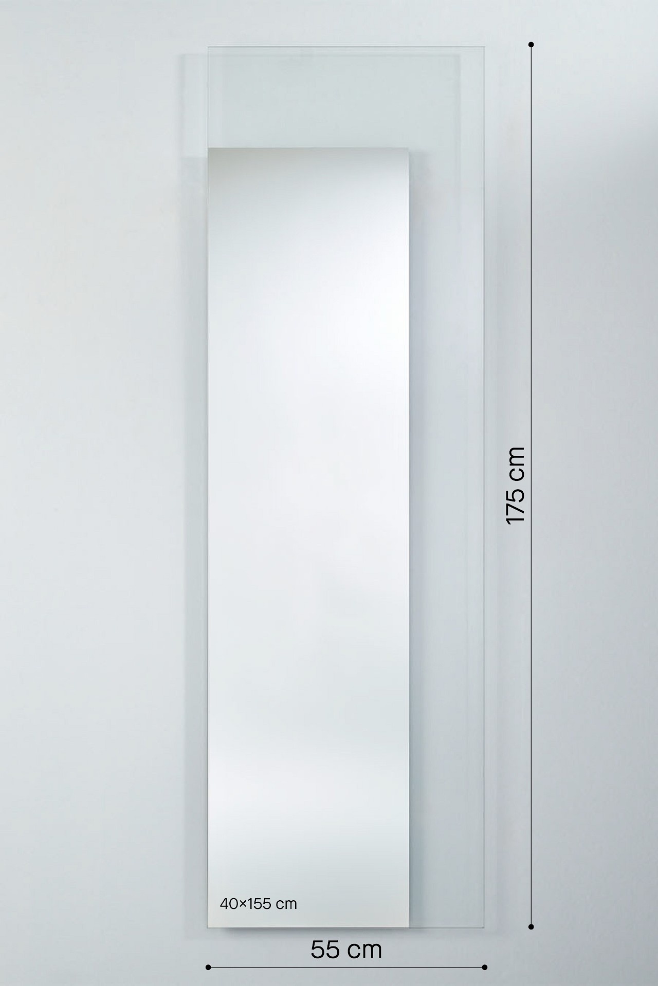 Les zones argentées sont coupées abruptement sur deux côtés, tandis que les autres côtés se fondent harmonieusement dans le verre transparent qui se confond avec le mur. Cela crée l'illusion que le miroir et le mur ne font qu'un. Selon la lumière du jour, de douces ombres architecturales apparaissent, donnant l'impression que le miroir flotte.