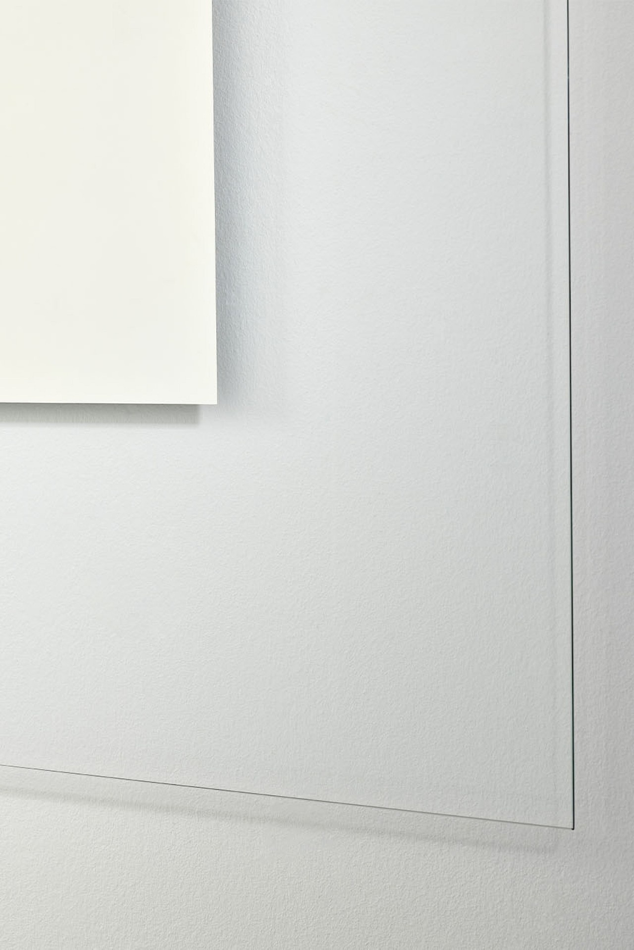 Les parties argentées sont coupées de manière abrupte, tandis que les zones transparentes se fondent doucement dans le mur. Cela crée une illusion où le miroir et le mur semblent ne former qu'un. En fonction de la lumière, un jeu d'ombres architectural se crée, donnant au miroir un caractère flottant et dynamique.