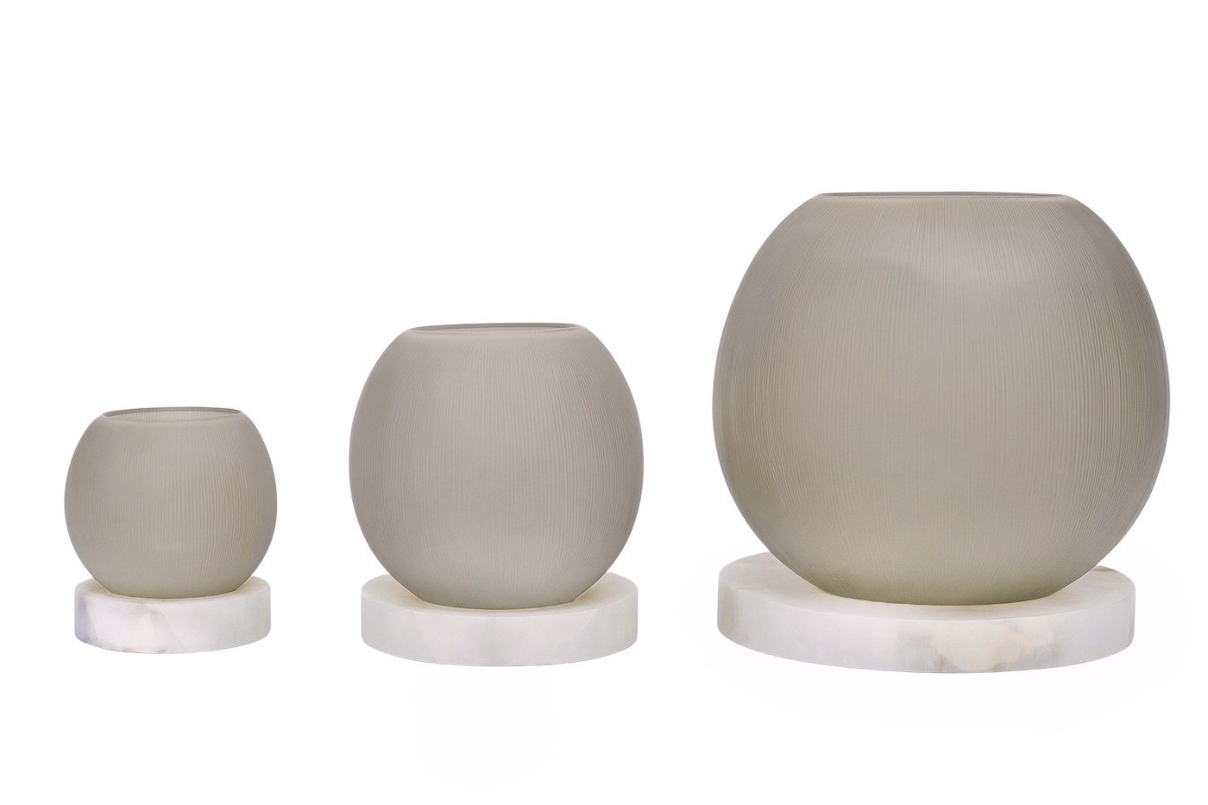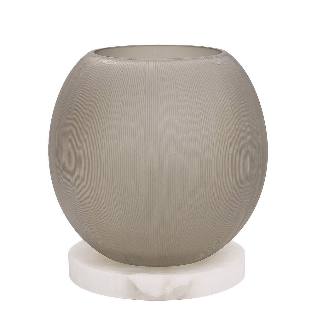 La lanterne Kasian est fabriquée en verre soufflé à la bouche, qui est ensuite travaillé à la main pour lui donner sa texture. La lanterne repose sur un socle en albâtre mat. La couleur gris fumé du verre s'harmonise à merveille avec les textures colorées de l'albâtre.