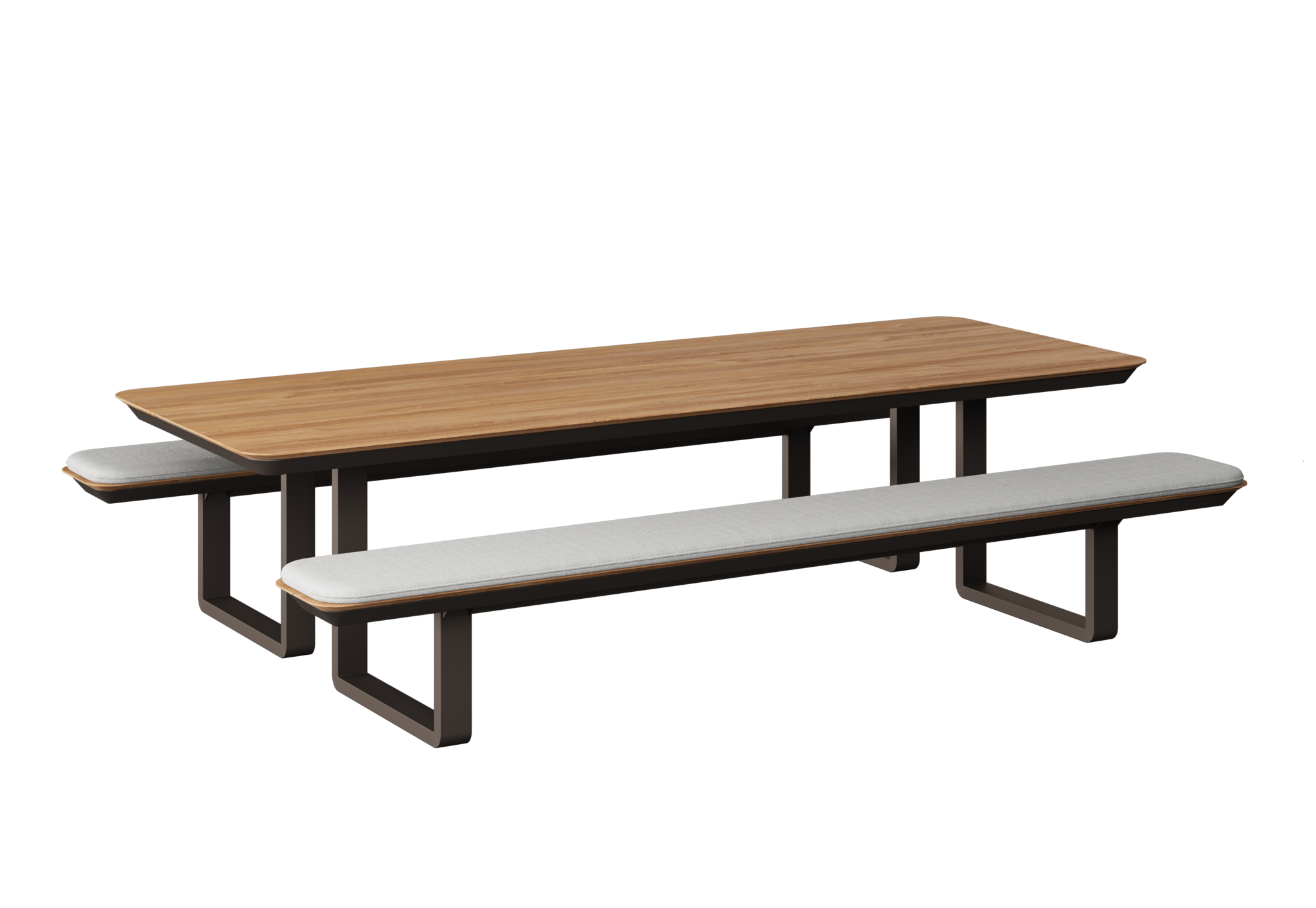 La table de pique-nique Ferrera a été conçue comme un ensemble sculptural dans lequel la table et les bancs se fondent en un design puissant mais raffiné. Le cadre en aluminium bronze soutient un magnifique plateau en teck avec un bord biseauté, ce qui confère au meuble un aspect élancé et contemporain. Les coussins d'assise inclus assurent le confort sans compromettre le caractère pur et équilibré du design.