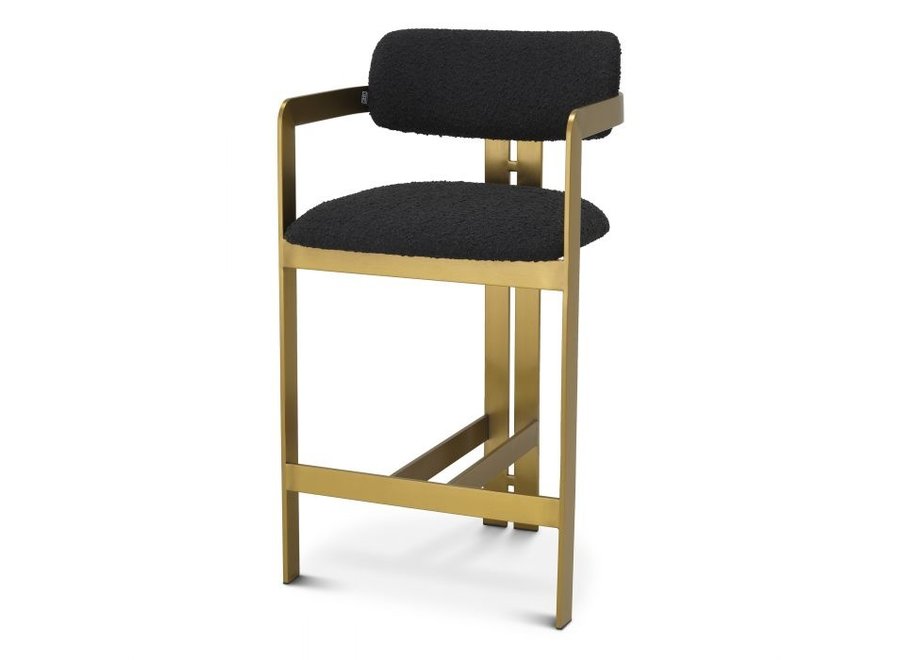 Invitant et raffiné avec un soupçon de design rétro, le tabouret de comptoir Donato ajoutera une touche de style vintage à tout espace. Doté d'un cadre géométrique en laiton brossé, d'une assise circulaire et d'un dossier incurvé dans un rembourrage noir Bouclé, ce tabouret de comptoir associe confort et fonctionnalité.