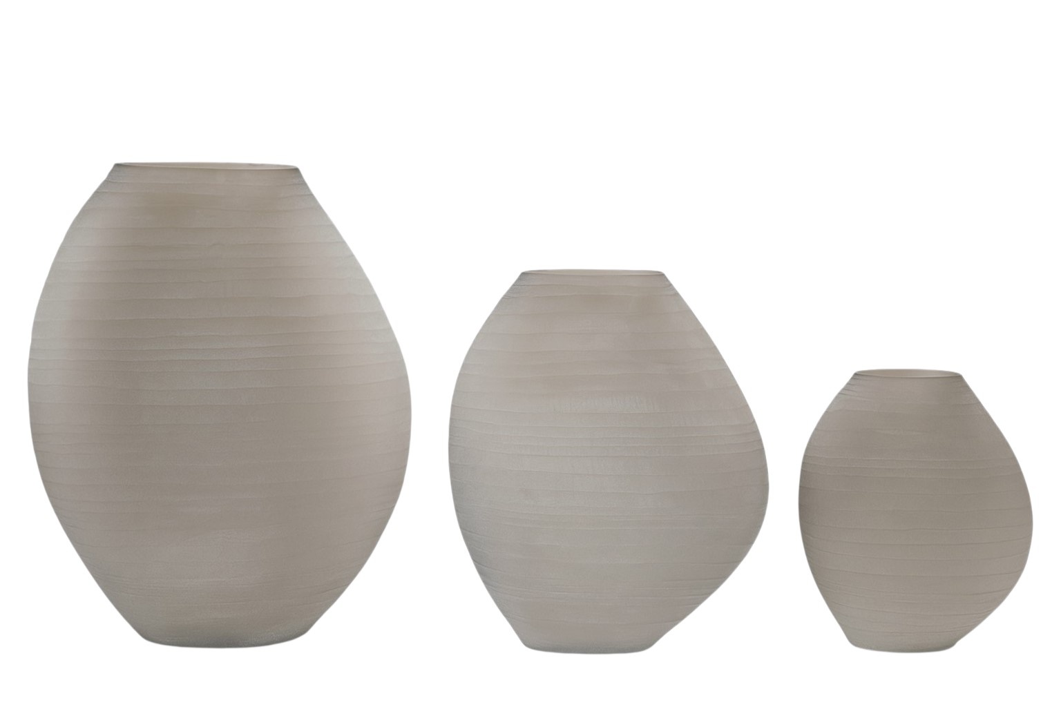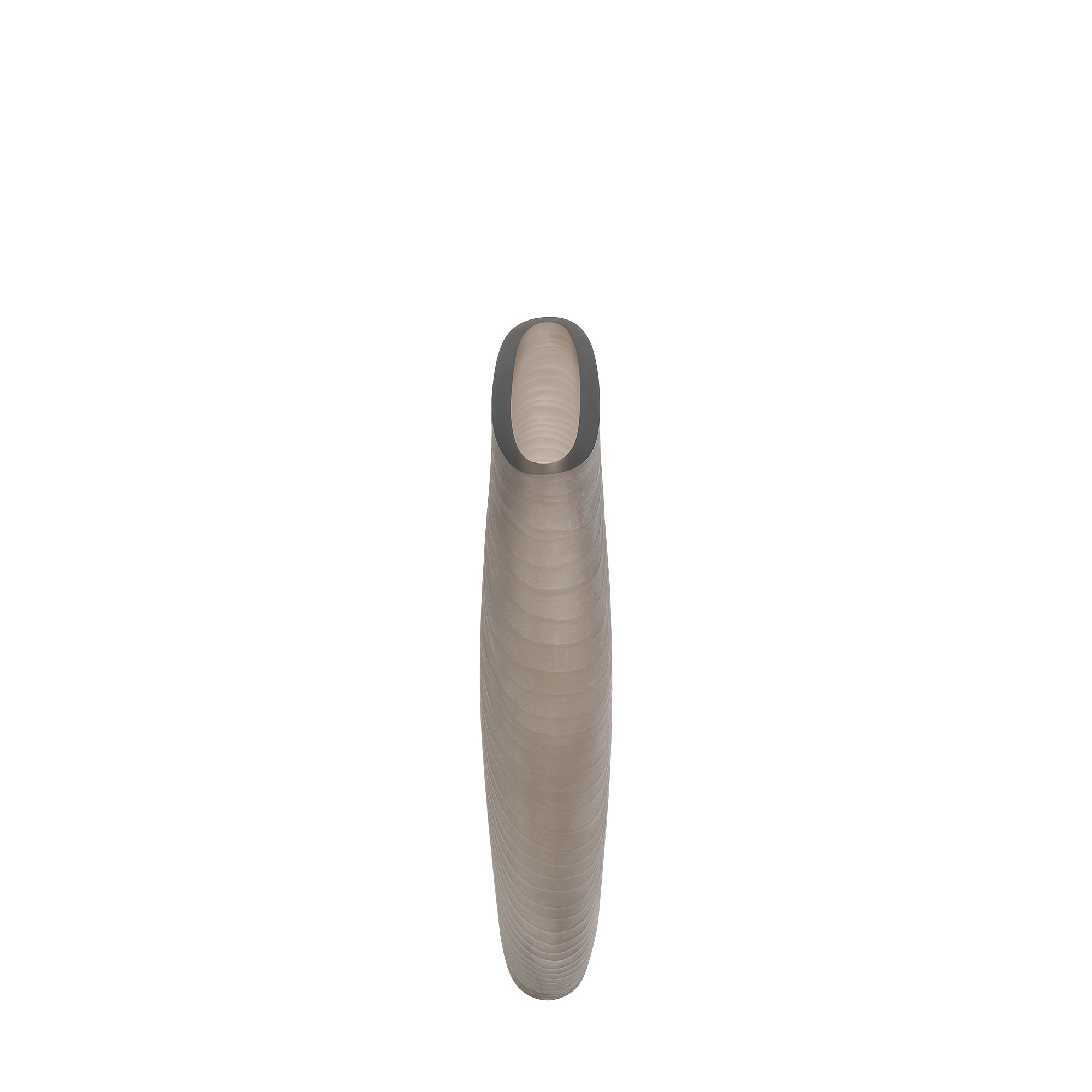 Le vase Marias est fabriqué en verre soufflé à la bouche, qui est ensuite travaillé à la main pour y apposer les textures horizontales. La couleur gris fumé du verre, associée à la forme organique du vase, lui confère un aspect luxueux.