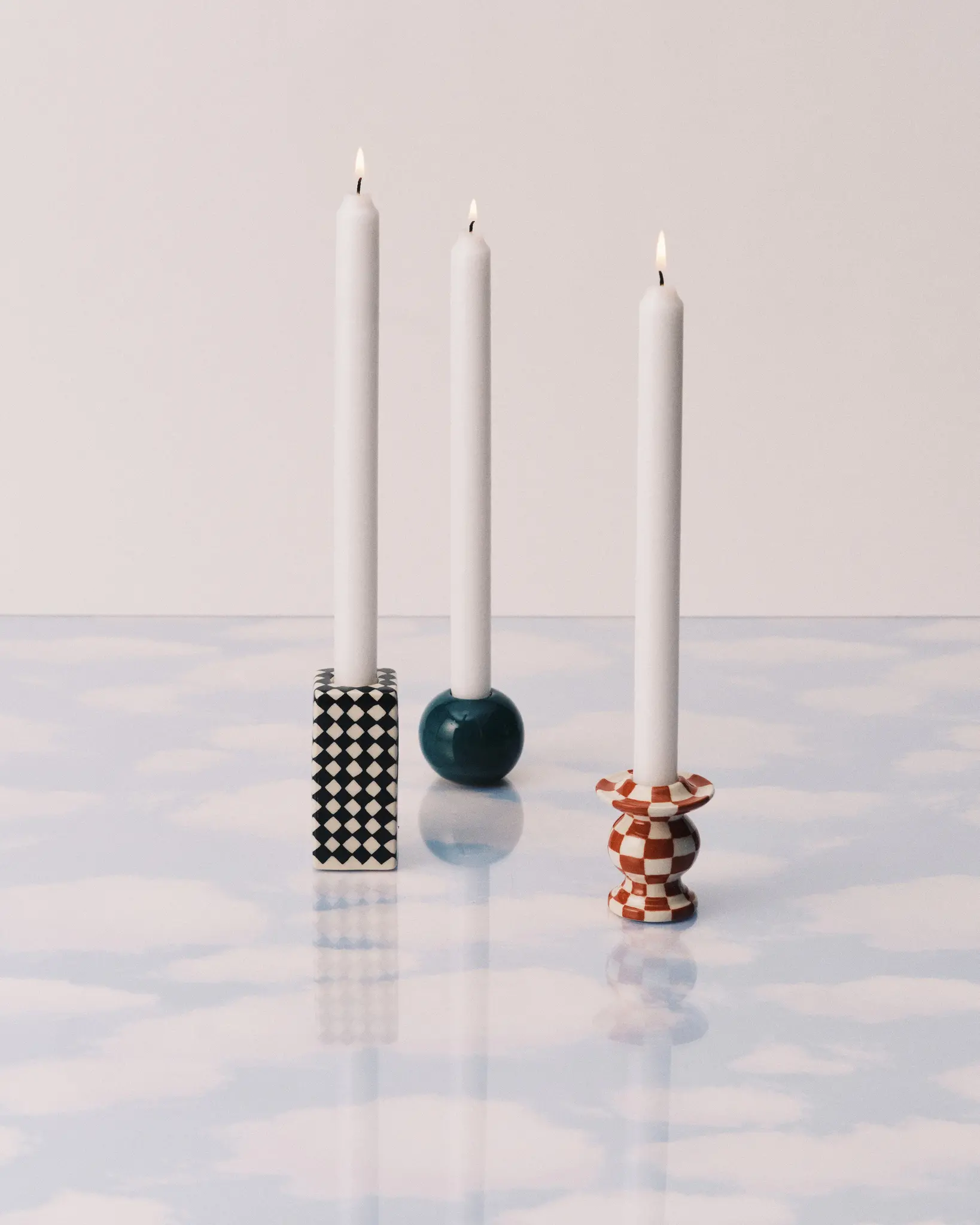 Les créateurs de bijoux Wouters & Hendrix ont créé une ligne de bijoux d'intérieur avec leur collection Les Objets Mouleversants : des objets qui insufflent magie et beauté à votre table et qui s'inspirent du surréalisme. Ces chandeliers en céramique ont été peints à la main dans un motif de damier, un élément visuel que Wouters & Hendrix ont déjà utilisé par le passé. Les chandeliers se déclinent en trois formes ludiques mais équilibrées : le rectangle, la sphère et le totem. Les Objets Mouleversants est également disponible dans un coffret cadeau. La bougeoir set est emballés dans un giftbox.
