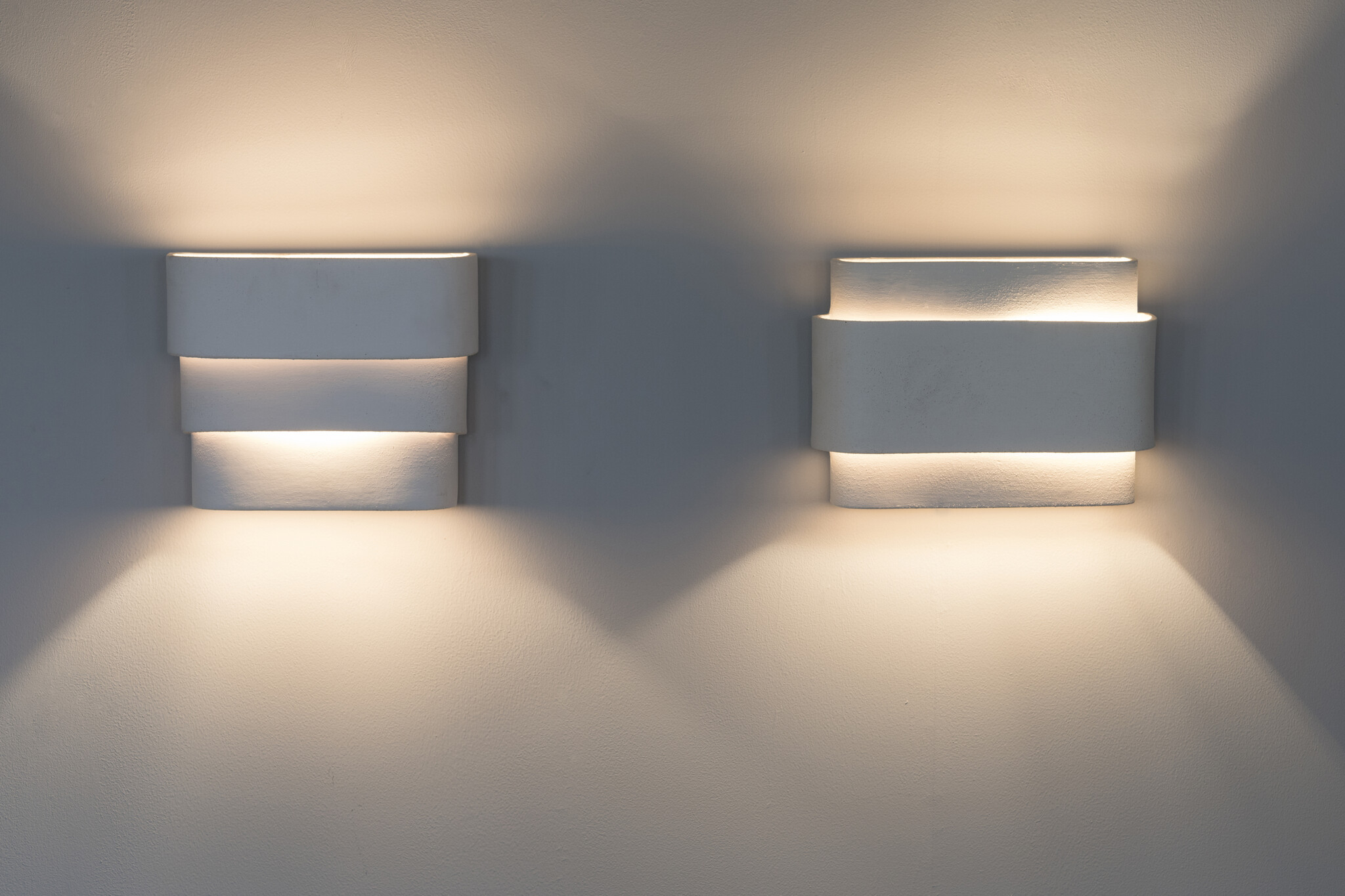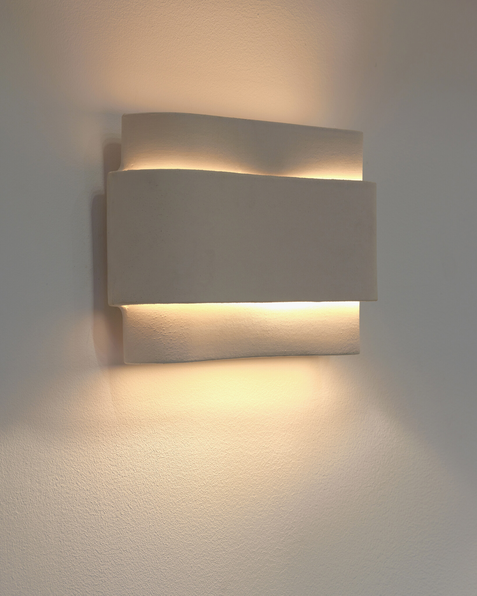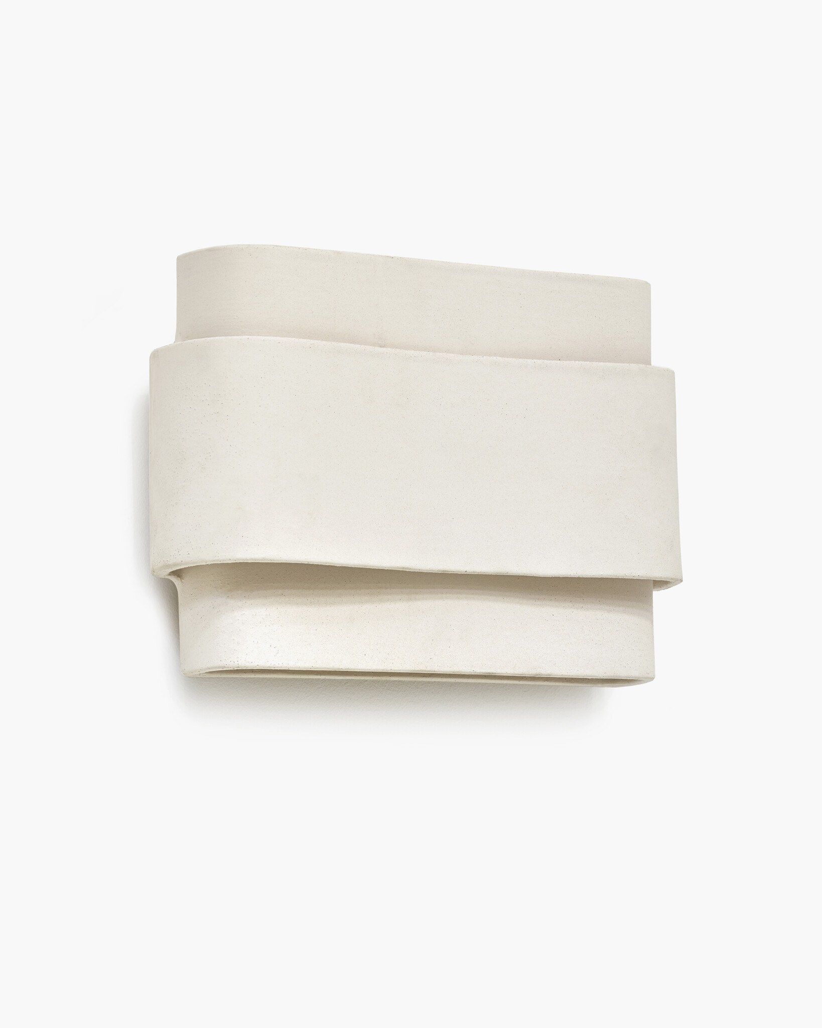 Unieke beige-kleurige stenen wandlamp gemaakt van verschillende stroken klei. Deze Louis wandlamp brengt het handgemaakte karakter naar voren.