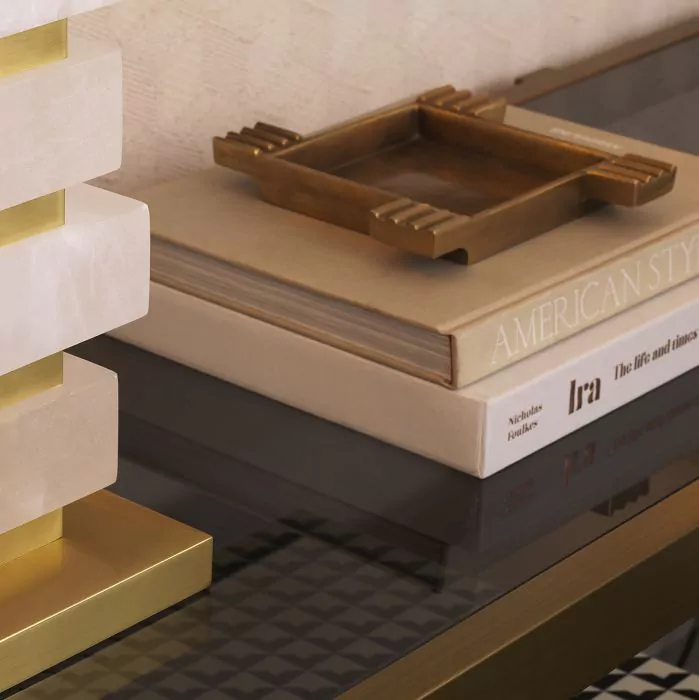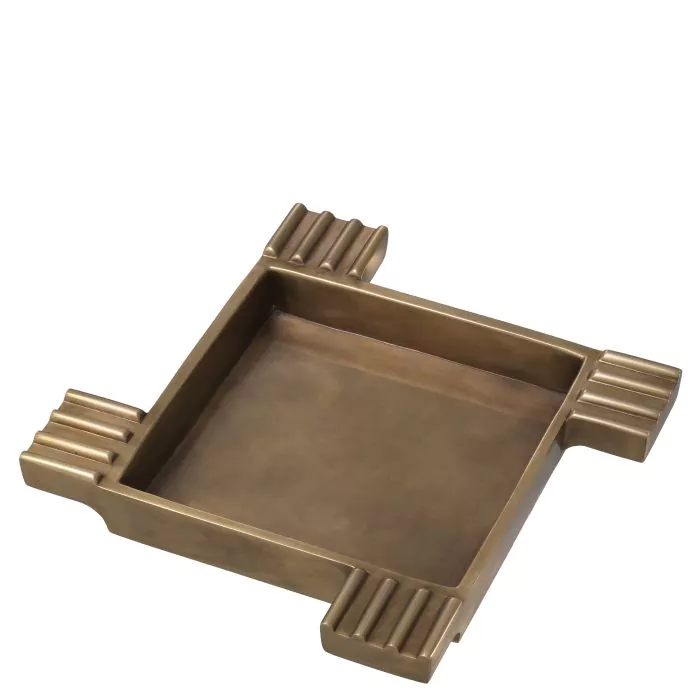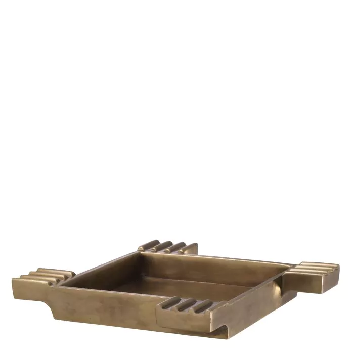 De symmetrische Ashtray Mack straalt een grafische aantrekkingskracht uit met zijn sigarettenhouders die elke hoek benadrukken. Deze prachtige vierkante asbak heeft een vintage messing afwerking en past goed in een eigentijdse, minimalistische setting.