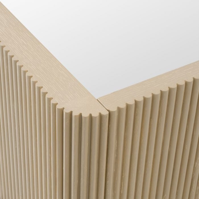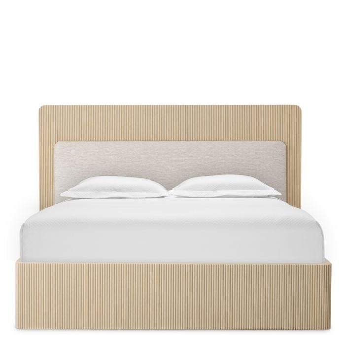Het Dimitrios-bedframe is gemaakt van geribbeld massief hout in een lichte kleur, aangevuld met natuurlijke Durini-stof. De verfijnde combinatie van gestructureerd hout, eikenfineer en zachte bekleding zorgt voor een verfijnde, moderne look met ingetogen, elegante tinten. Zorgvuldig ontworpen om te worden gecombineerd met een boxspring, voor uitzonderlijk comfort en ondersteuning.