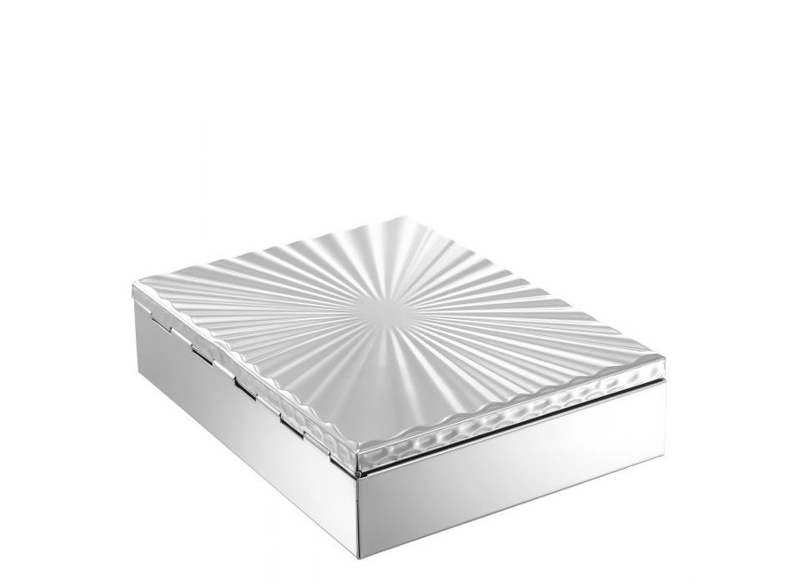 De Corpo Box is de ideale plaats voor het bewaren van speciale herinneringen, brieven, postkaarten en souvenirs van familie en vrienden. Deze accessoiredoos is afgewerkt in zilver en is elegant en verfijnd. Mooie reliëfpatronen versieren het deksel, dat een illustratie is van deskundige handwerktechnieken.