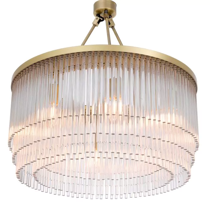 Verfraai uw interieur met de glamoureuze kroonluchter Hector S. Deze eigentijdse interpretatie van Art Deco design is versierd met etages van heldere glazen staven. Het geeft een aangenaam sfeerlicht en is voorzien van een lichte messing afwerking.