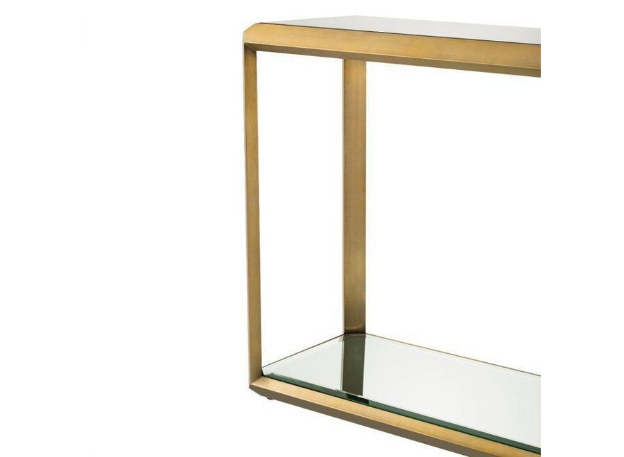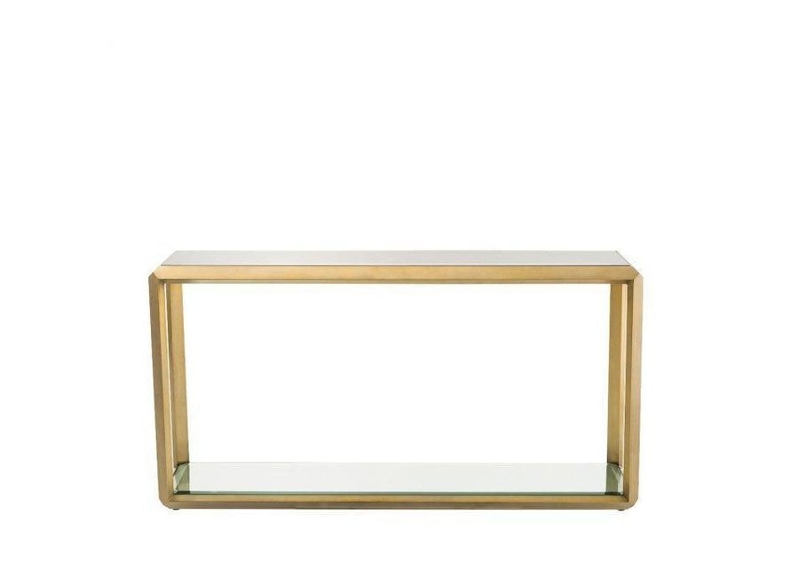 Roep de verleidelijke stijl van de jaren zeventig op met de decadente Callum Console Table. Het frame van geborsteld messing met afgeschuinde randen omgeeft het tafelblad van rookglas en de onderste plank van spiegelglas. Of je nu voor een retro of een eigentijdse look gaat, deze stijlvolle consoletafel is een perfecte keuze.