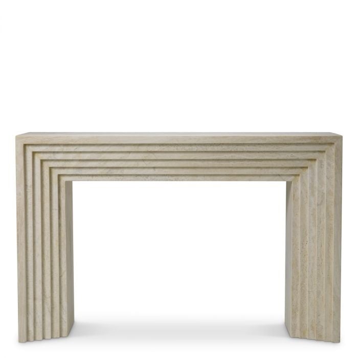 De Console Table Tarrington straalt serene luxe uit en heeft een strak travertijn oppervlak met natuurlijke aders die elegantie uitstralen. Het minimalistische ontwerp benadrukt de beige tinten van de steen en creëert een verfijnd middelpunt dat een verfijnd interieur met moeiteloze gratie en moderne uitstraling naar een hoger niveau tilt.