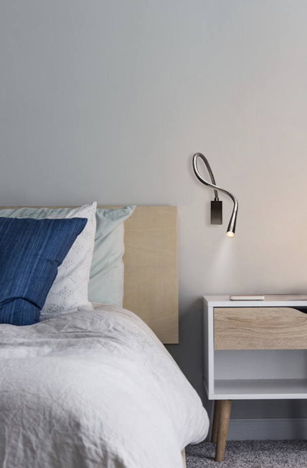 Bedleeslamp ‘Flexiled’; een speelse flexibele arm fungeert als ideale bedleeslamp. Haal de sfeer van een vijfsterren hotel in huis!