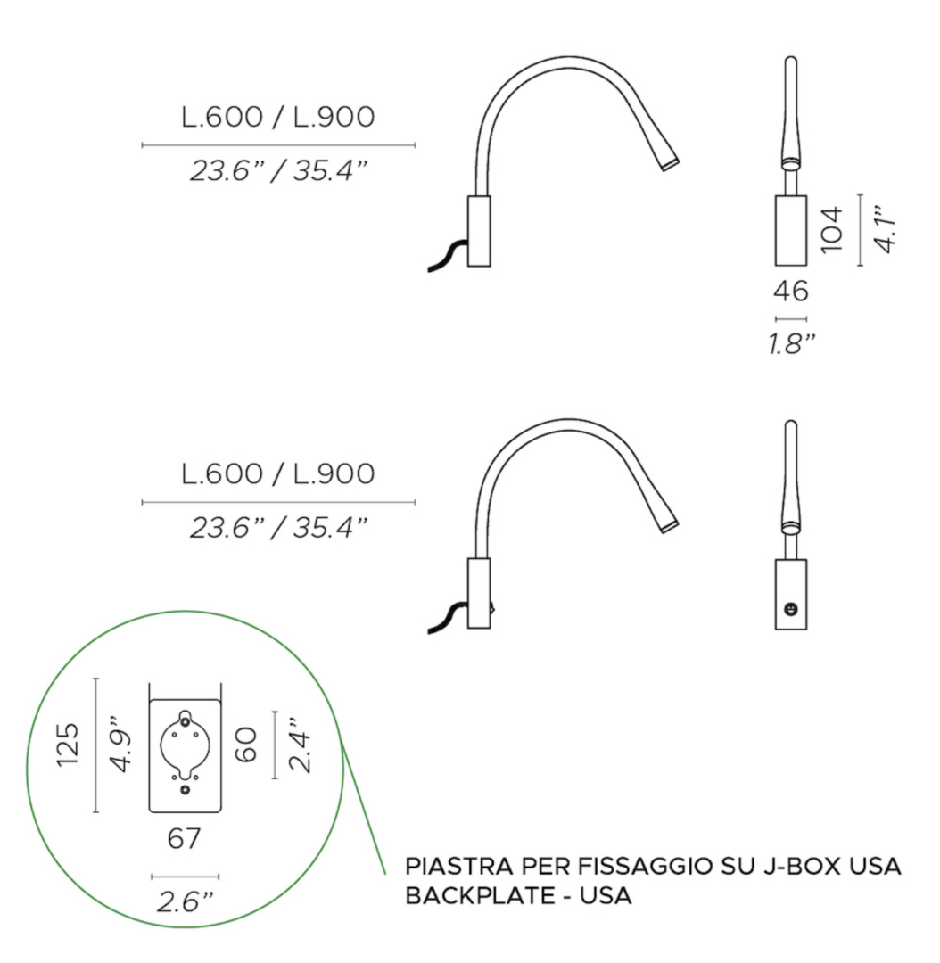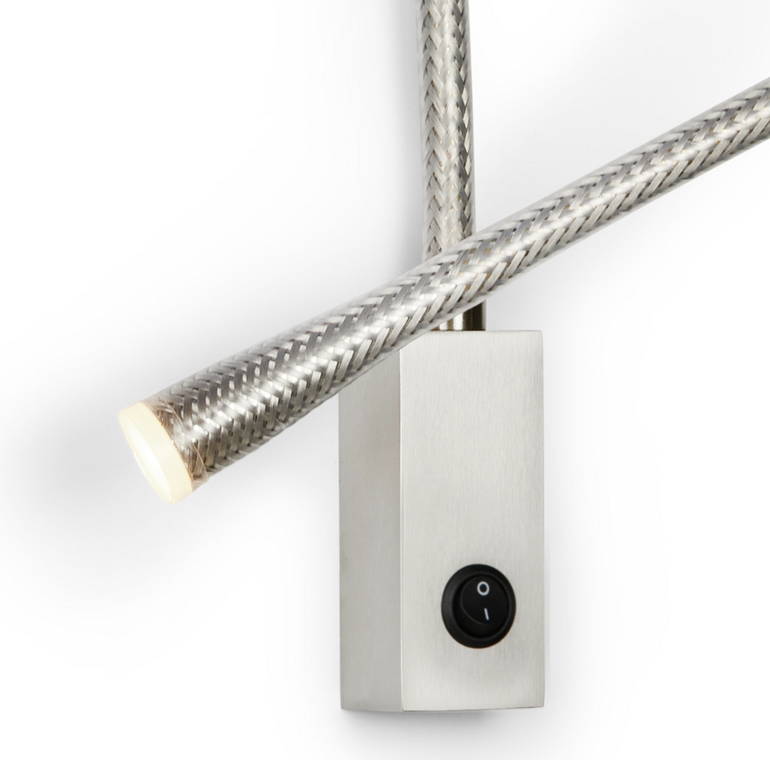 Bedleeslamp ‘Flexiled’ wordt aangeboden in een echt lederen afwerking in donkerbruin, ivoorwit of zwart met een gesatineerd bronzen wandplaat, of in geborsteld staal met gesatineerde nikkel wandplaat. De lens is van wit polycarbonaat. Flexiled geeft directe doelverlichting (bedleeslamp), of accentverlichting en wordt aangeboden met een Aan/Uit schakelaar op de wandplaat. De bedleeslamp is ontworpen om verticaal op de aansluitingsdoos (5x10) te monteren. De lengte is 90cm, dit model is ook verkrijgbaar met een lengte van 60cm.