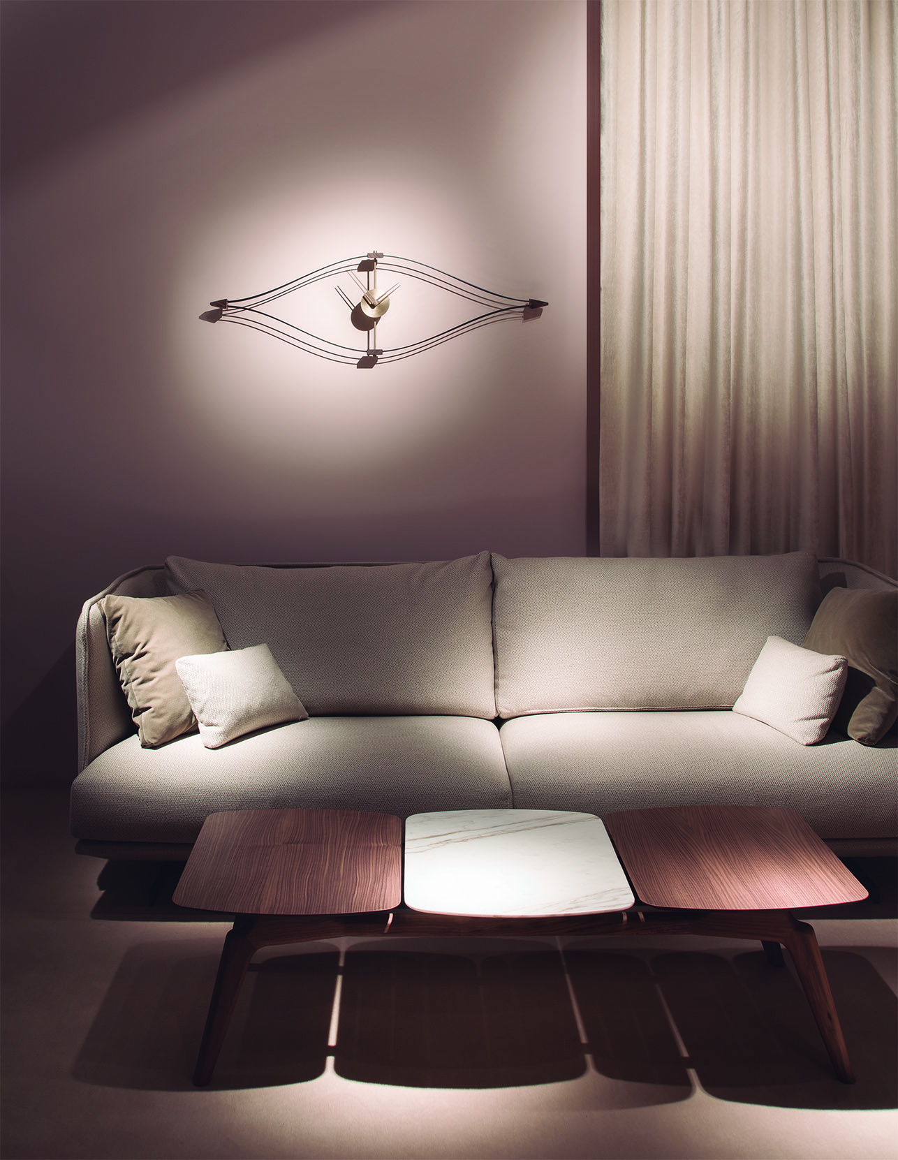 Het oog dat getuige is van het verstrijken van de tijd. Verre van het ongebruikelijke ronde silhouet, innoveert het met zijn speciale zwarte glasvezelvorm, waarbij messing details worden gecombineerd met wengéhouten wijzers.