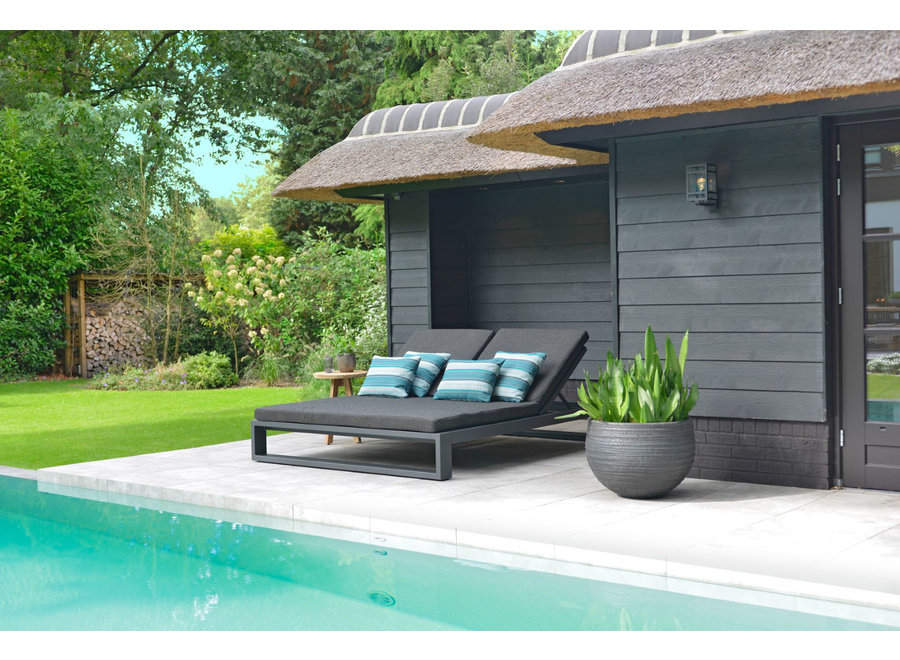 De Vitoria collectie van Studio Borek kenmerkt zich door het gebruik van aluminium latten. Dit is terug te zien in de tafels en ligbedden. Dit dubbele ligbed heeft ook deze latten en is voorzien van een dik all weather kussen. De hoofdsteunen zijn afzonderlijk van elkaar te verstellen en kunnen helemaal plat om zo een zonnebed te creëren. Verkrijgbaar in de kleuren wit of antraciet Dit aluminium is eenvoudig te reinigen met Borek Multi Cleaner.