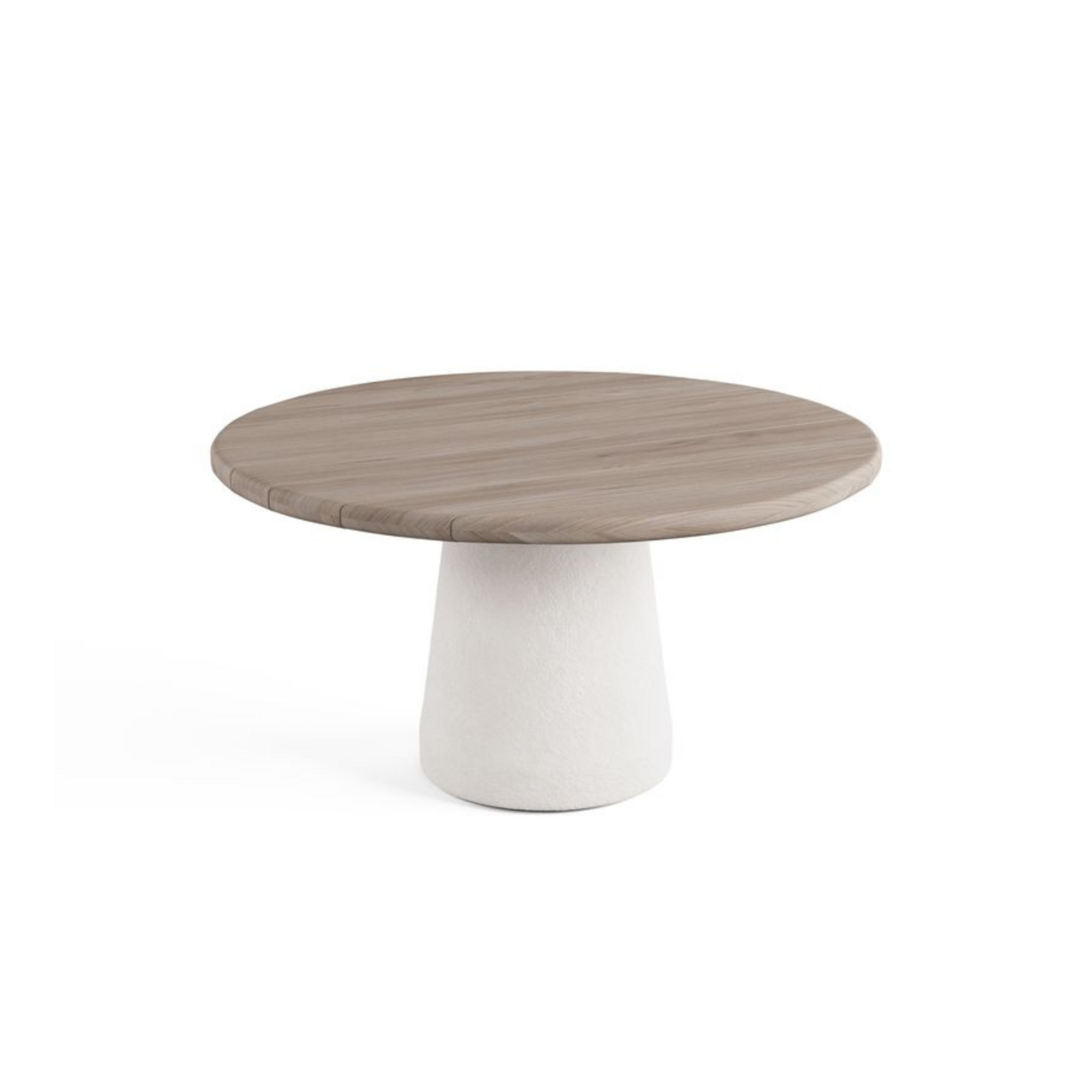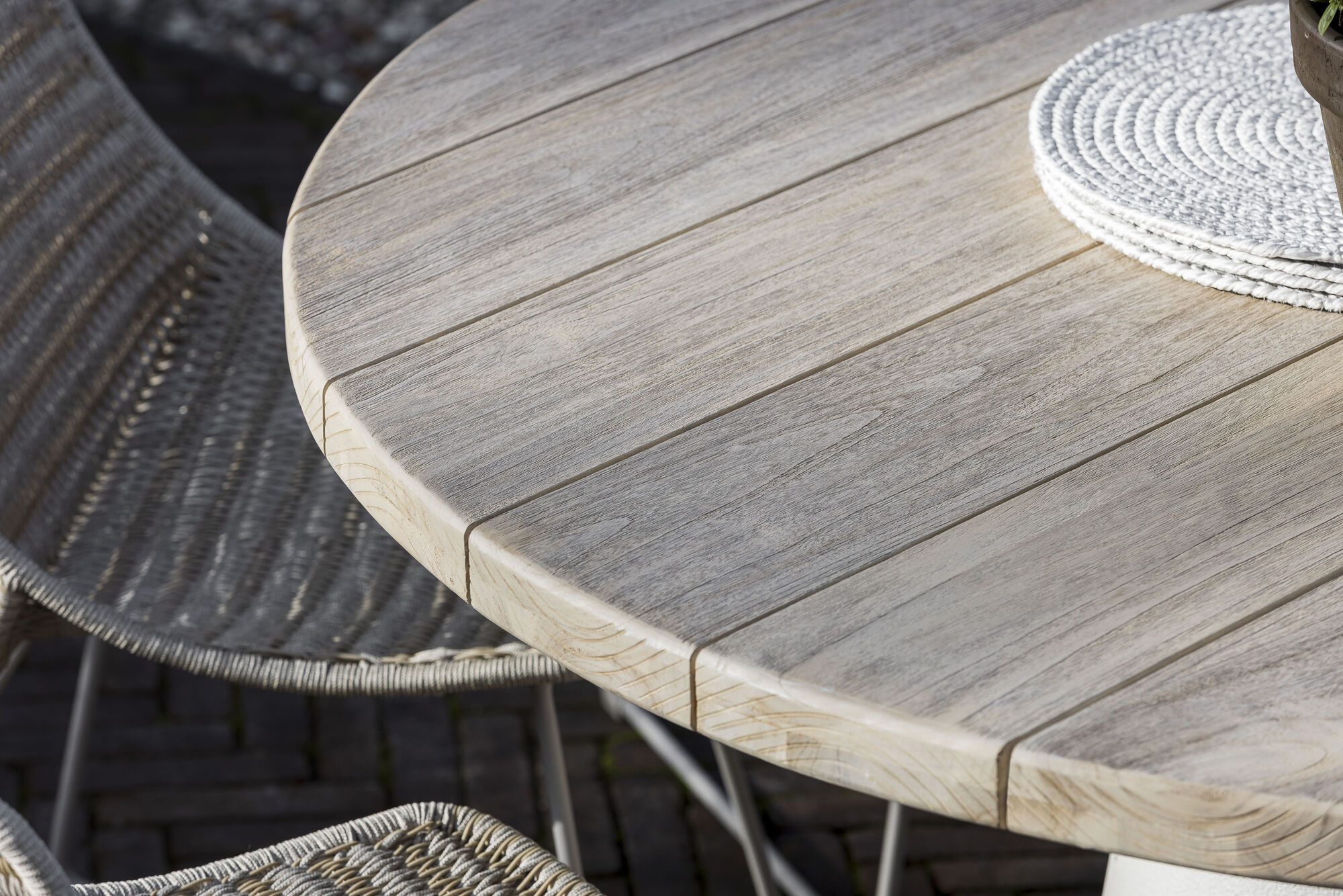 Het onderstel van de Oliva tafel is gemaakt van fiberglass in de kleur white onyx met daarop een aged teak blad. Een knusse tafel waaraan vele soorten stoelen geplaatst kunnen worden zoals bijvoorbeeld de Ravenna stoel.