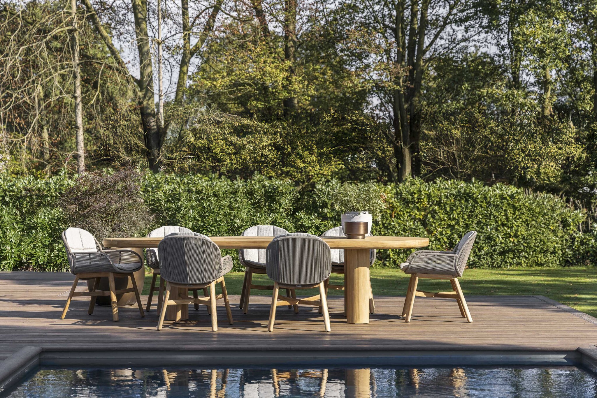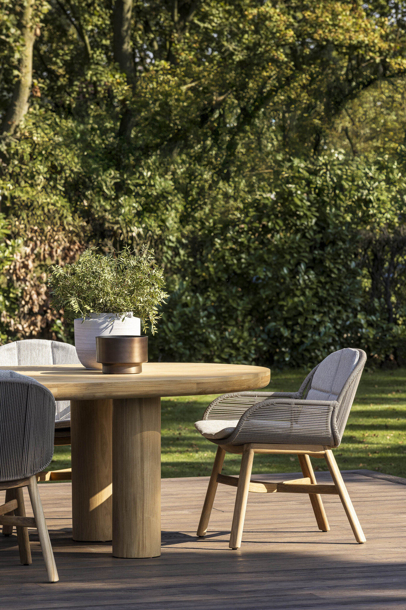 De Barrel dining chair brengt warmte en zachtheid terug in een wereld vol strakke buitenmeubelen. Ontworpen door Maarten Olden ademt deze eetstoel een natuurlijke elegantie die elke buitenruimte verrijkt. Het iconische teakframe met subtiel uitstaande poten en afgeronde lijnen vormt de basis van de handgevlochten kuip van kleurvast Ardenza-rope. De zachte, organische rondingen nodigen uit tot lang tafelen, van een ontspannen lunch tot een avond die langzaam verstrijkt. Duurzaam teakhout dat mooi vergrijst en stevig rope maken de stoel bestand tegen weer en wind. De Barrel dining chair staat voor vakmanschap, tijdloze materialen en een omarmende vormtaal die uitnodigt tot verstilling, comfort en samenzijn aan tafel.
