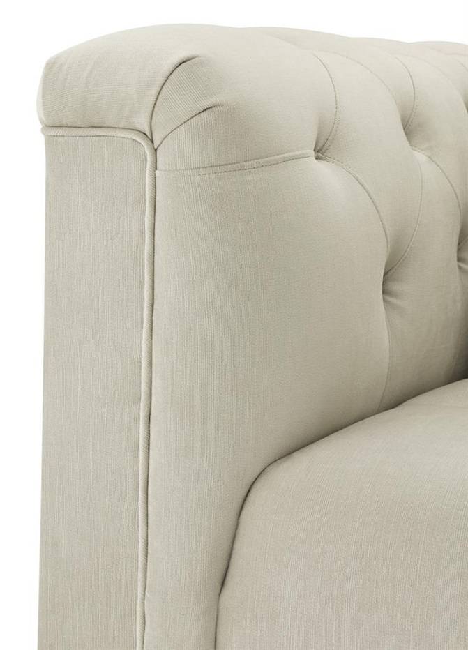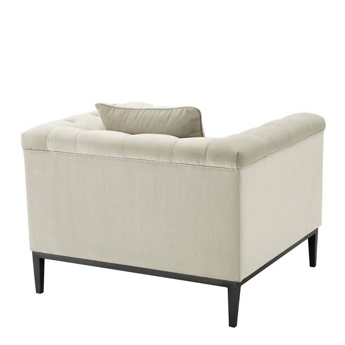 De Cesare Chair in kiezelgrijze stoffering is geïnspireerd op de klassieke Chesterfield-meubels en heeft een subtieler ontwerp met een knopenrug, zacht gebogen met geborduurde stiksels in rechte lijnen. Hij wordt geleverd met een zwart gunmetal onderstel voor een monochroom contrast.