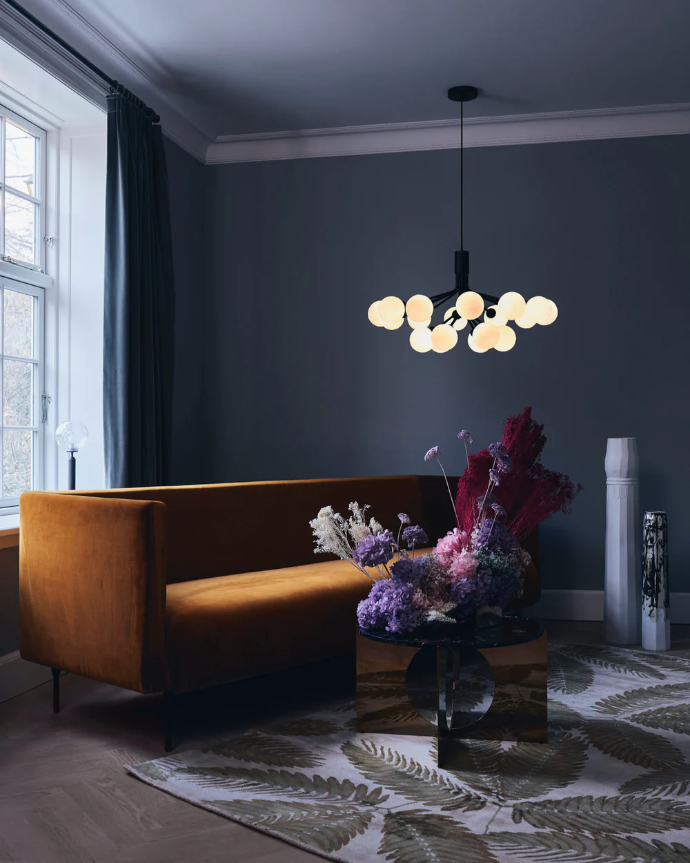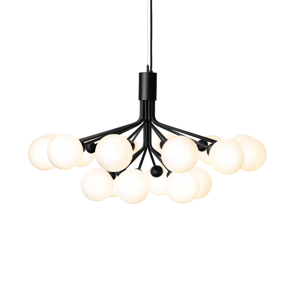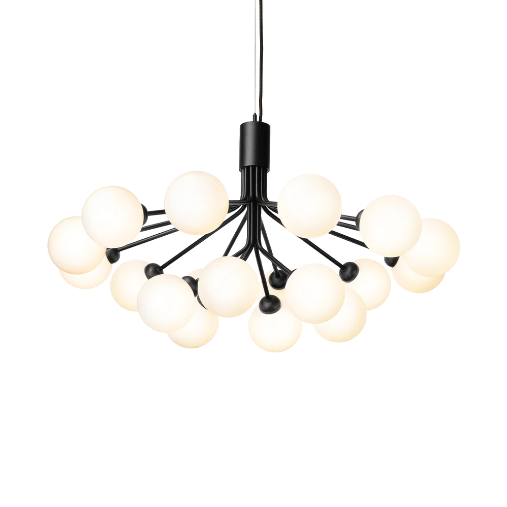 De Apiales 18 is de grootste kroonluchter uit de Apiales collectie. Met mondgeblazen glazen bollen en een speciaal ontworpen metalen canopy en armen verspreidt deze lamp een warm en uitnodigend licht. Perfect als eyecatcher in de foyer, een ruime woonkamer of boven een grote eettafel