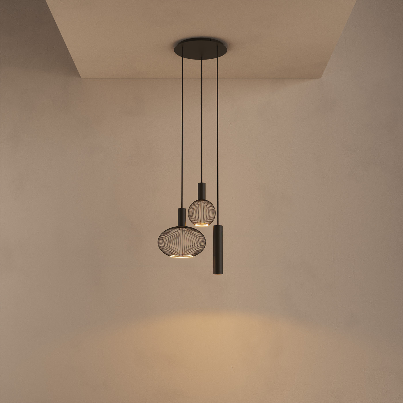 Het licht is warm en sfeervol, maar blijft functioneel dankzij de evenwichtige lichtverdeling van de verschillende lichtbronnen. Een ideale lamp voor boven een kleine eettafel, een zithoek of als accentverlichting in een groter interieur.