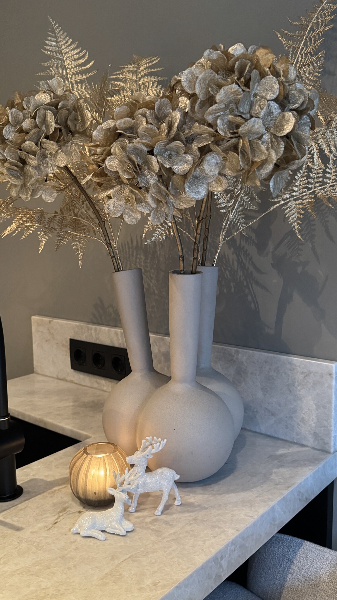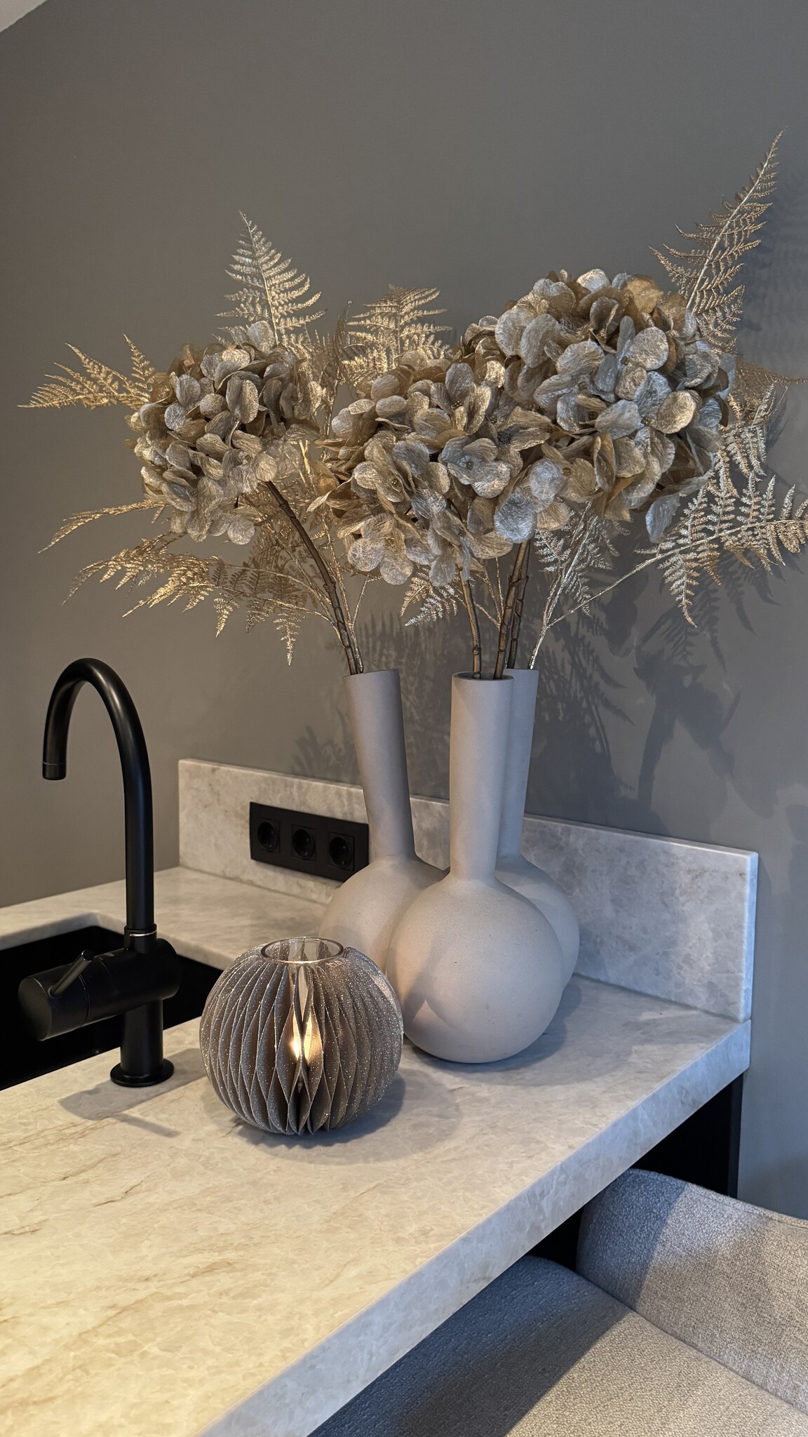 De Hydrangea kunsttak in de kleur gold is mooi om te presenteren met meerdere takken in een vaas of om een bestaand boeket een feestelijke touch te geven. Door het ijzerdraad in de stelen kan je de stelen buigen naar wens. Deze grote stelen worden is sets van twee verkocht.