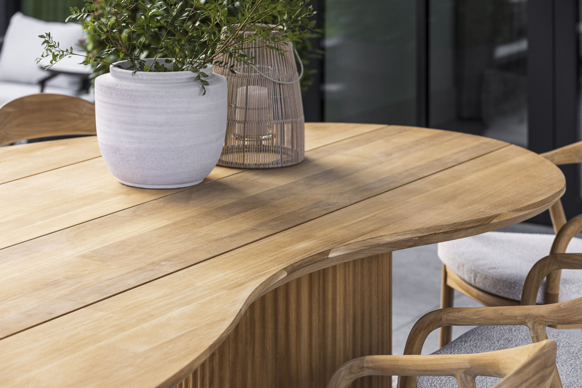 De Venezia collectie introduceert een nieuwe vormentaal binnen Max en Luuk. De tafels zijn ontworpen als vloeiende landschapselementen, met zachte contouren die iedere buitenruimte een natuurlijke elegantie geven. Met zowel dining als low dining modellen, uitgevoerd in organische vormen en het karakteristieke kidney silhouet, brengt Venezia een speels maar verfijnd ritme aan rond elke zitopstelling. Het massieve teakhouten blad vormt het warme hart van de collectie. De lichte afrondingen en subtiele variaties in het hout maken elke tafel uniek, terwijl de rijke structuur van het teak voor een uitnodigende, natuurlijke uitstraling zorgt. Toch voelt Venezia nooit zwaar: de vormgeving is licht, soepel en harmonieus, alsof de tafel zich vanzelf in de ruimte heeft gevormd. De sculpturale kolompoot, opgebouwd uit verticale lijnen, geeft de tafels een moderne, bijna architectonische uitstraling. Hij biedt stabiliteit zonder de zachtheid van het ontwerp te doorbreken en laat het blad als het ware zweven. In low dining ontstaat een ontspannen setting waar avonden langer duren, terwijl de dining variant juist een vertrouwd middelpunt vormt voor diners en samenzijn. Het kenmerkende kidney model voegt daar een extra dimensie aan toe. De asymmetrische vorm nodigt uit tot een speelse interpretatie van de ruimte en creëert een dynamisch geheel dat zich onderscheidt van traditionele tafels. Perfect voor wie het buitenleven graag in een meer vrije, organische vorm giet. Venezia is een collectie voor liefhebbers van natuurlijk materiaal, moderne eenvoud en zachte beweging in het ontwerp. Een serie tafels die even prettig aanvoelt als zij eruitziet en die elke buitenruimte verrijkt met karakter en rust.