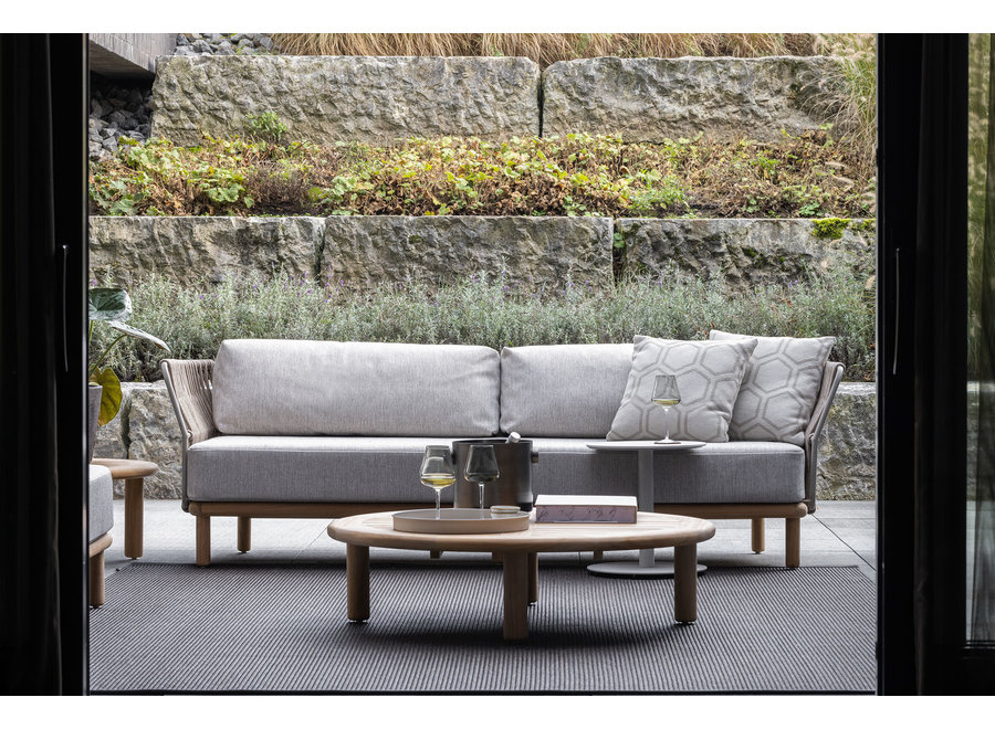 De sofa heeft een royaal formaat van bijna tweeënhalve meter. De fauteuil is eveneens riant met honderdzestien centimeter breedte. De materialisatie is zeer luxe met een stevige Ardenza rope in sepia grijs, dat in een fraai patroon om de aluminium rugleuning is gevlochten. De rugleuning waaiert als het ware vanaf de bovenste helft naar buiten toe uit, wat veel flair aan het moderne design toevoegt en het zitcomfort verhoogt. De grijze kussens voor de zitting en rugleuning ondersteunen het lichaam bovendien maximaal, waarbij het gebogen rugkussen elegant over de bovenzijde van het frame heen valt. Het zitkussen is op de hoeken afgerond, de vormgeving van het teakhouten onderstel volgend.