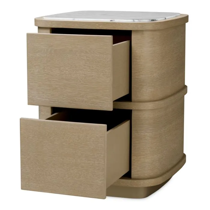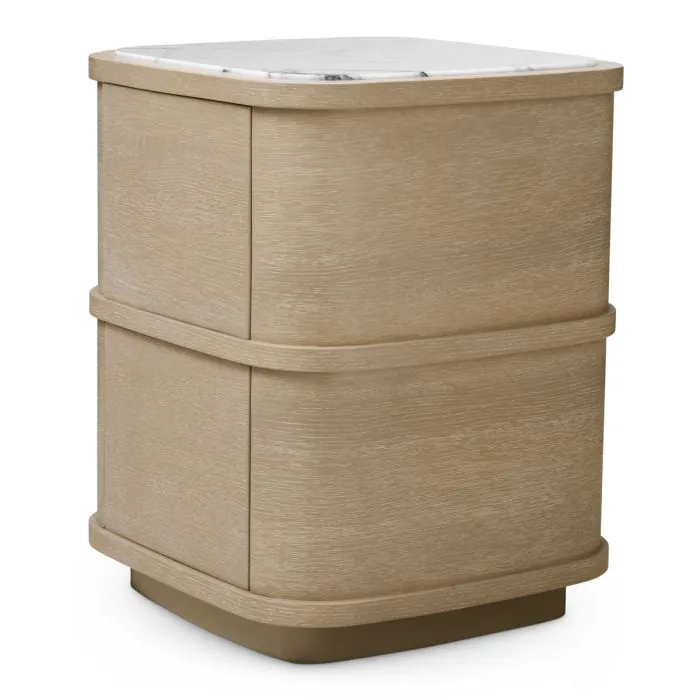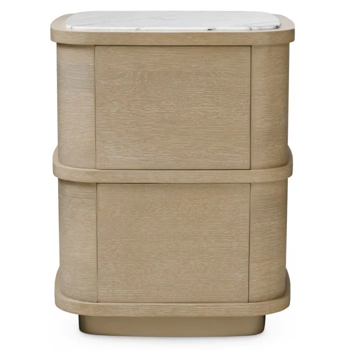 De Nightstand Cabana S straalt subtiele verfijning uit en is voorzien van een geraffineerd gewassen eikenfineer in combinatie met accenten van bianco lila marmer, die een zacht palet van natuurlijke warmte en delicate tinten creëren. Compact van formaat maar rijk aan textuur, biedt het een serene balans tussen elegantie en functionaliteit, op maat gemaakt voor de meest veeleisende interieurs.