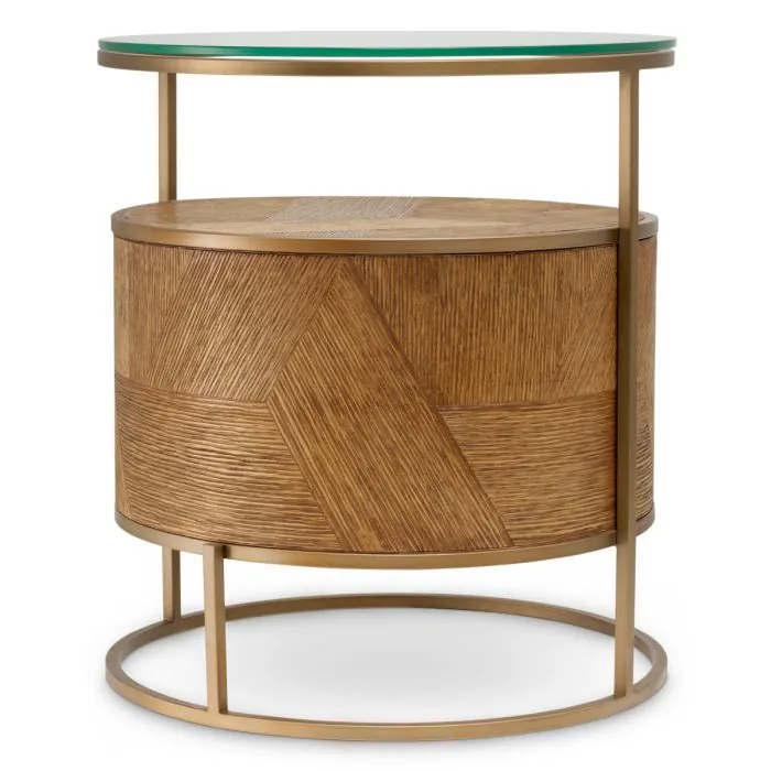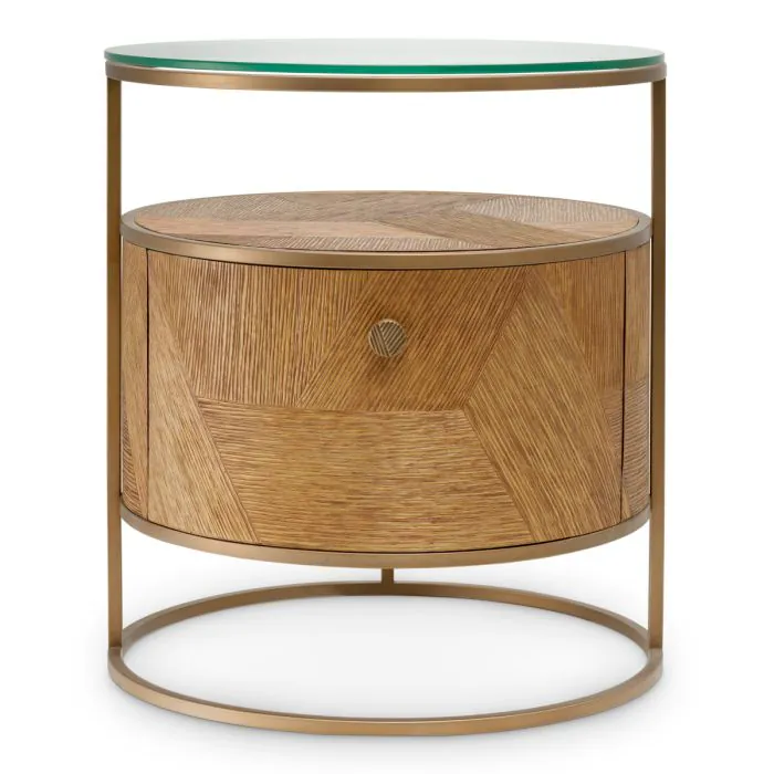 Geef uw interieur een upgrade met het nachtkastje Velutto, met een warm karamelkleurig eikenfineer in combinatie met een verfijnde geborstelde messing afwerking. Dit verfijnde meubelstuk biedt een evenwicht tussen organische textuur en subtiele metallic glans, en belichaamt een tijdloze elegantie die elke luxueuze omgeving verrijkt met ingetogen weelde.