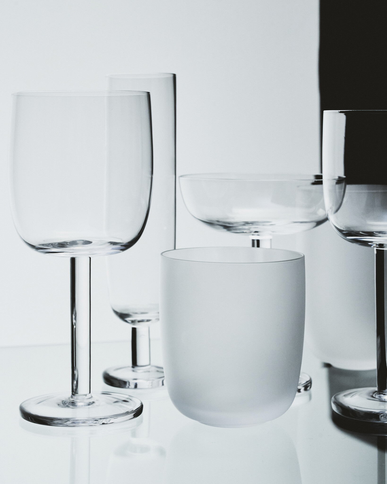 De 9 verschillende glazen uit de Base glaswerkcollectie volgen de trend van Studio Piet Boon's Base lijn voor Serax. Op een rechtopstaande voet in het midden van een perfect ronde cirkel stelen de 4 wijnglazen, 2 champagneglazen en het bierglas niet alleen de show, het kaliumglas maakt ze ook bijzonder sterk. De 2 waterglazen hebben een gezandstraald effect gekregen. De glazen zijn verpakt per 4 in een luxe giftbox.