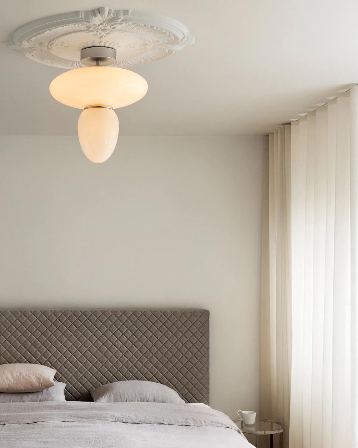 Rizzatto 42 is een plafondlamp die direct tegen het plafond wordt gemonteerd en unieke, decoratieve verlichting mogelijk maakt. De lamp heeft organisch gevormde glazen kappen en een metalen detailafwerking. Het zachte, gelijkmatige licht maakt Rizzatto 42 ideaal voor de slaapkamer, keuken of hal.
