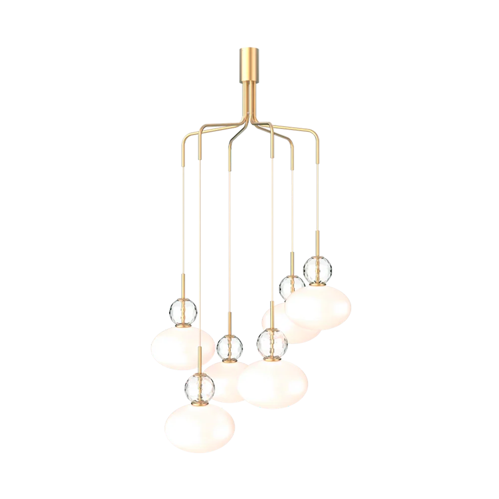 De Rizzatto Cluster 6 is een opvallende kroonluchter met zes pendels in een verstelbare formatie. Deze statement lamp geeft stijlvol licht en komt het best tot zijn recht in ruimtes met hoge plafonds.