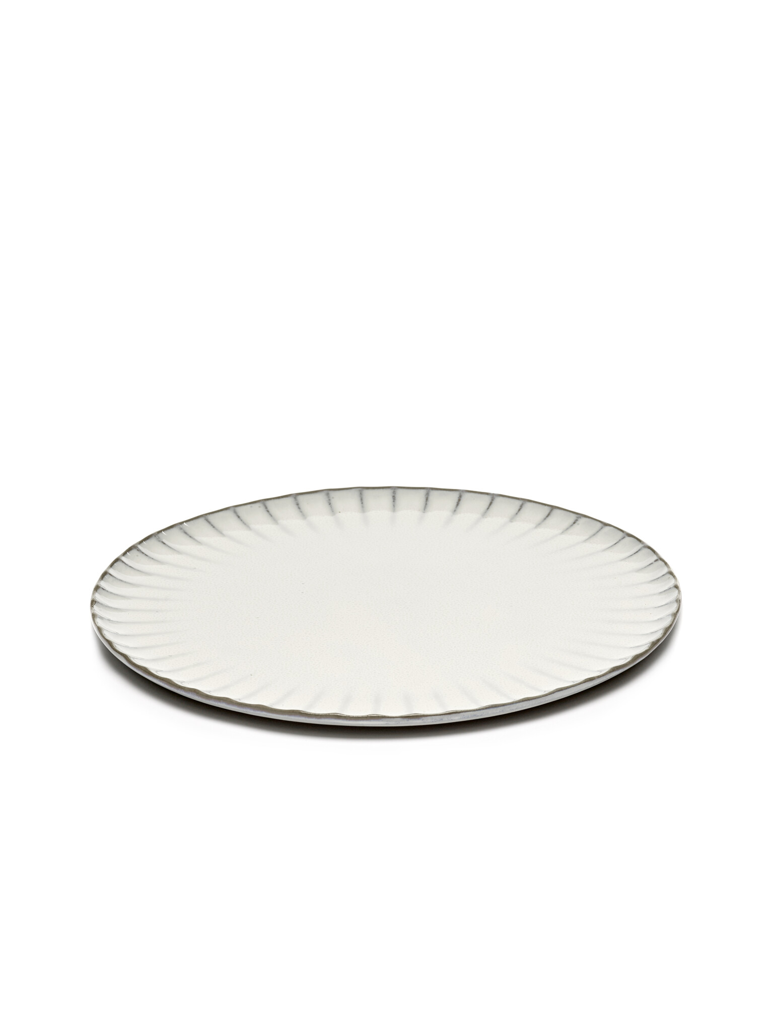 Rond bord van wit aardewerk. Servies met duidelijke verwijzingen naar schelpen, bloesems en de abstracte structuren van de natuur. De borden zijn per 4 verpakt in een luxe giftbox.