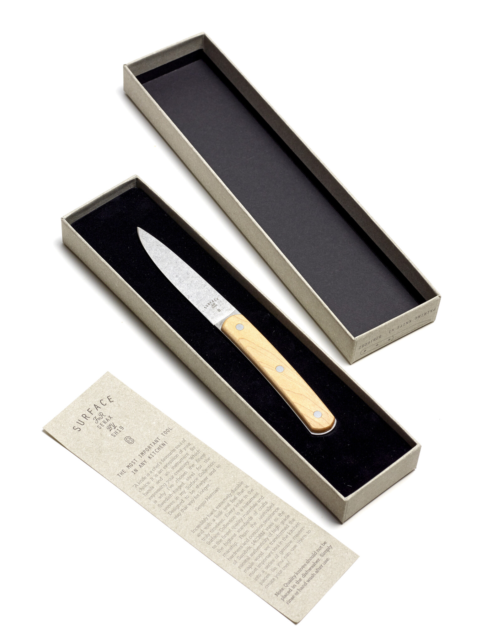 Liefde voor vakmanschap, vriendschap en perfecte samenwerking. Dat waren de drie pijlers die Tomer Botner, Serax en ik als basis voor de exclusieve, handgemaakte messen voor de Surface Collection hebben vastgelegd. Een groot allround keukenmes, een officemes voor het delicatere werk en een steakmes, met lemmeten van het sterkste Zweedse staal en handgrepen van hetzelfde hoogwaardige esdoornhout dat we gebruiken voor de snijplanken. Het pareermes is verpakt in een luxe giftbox.