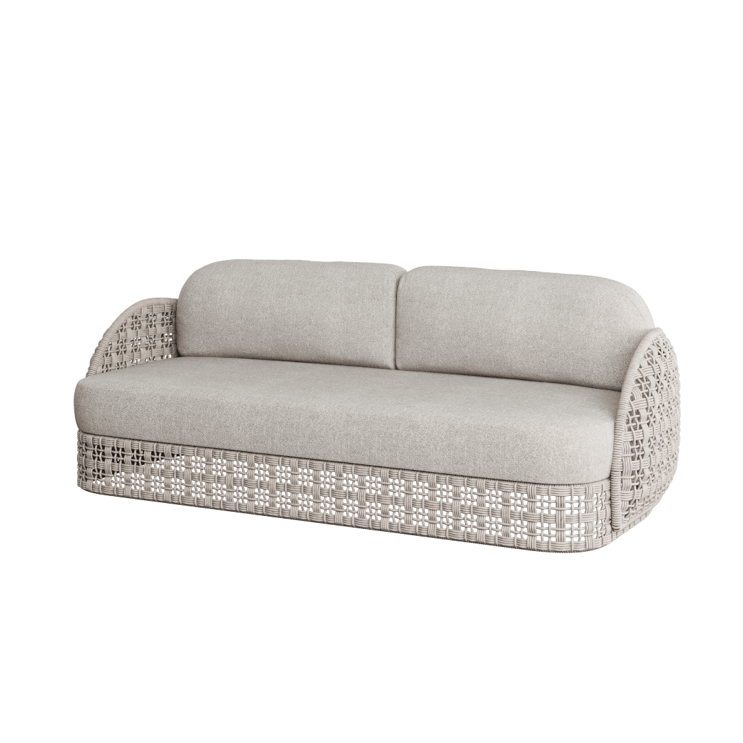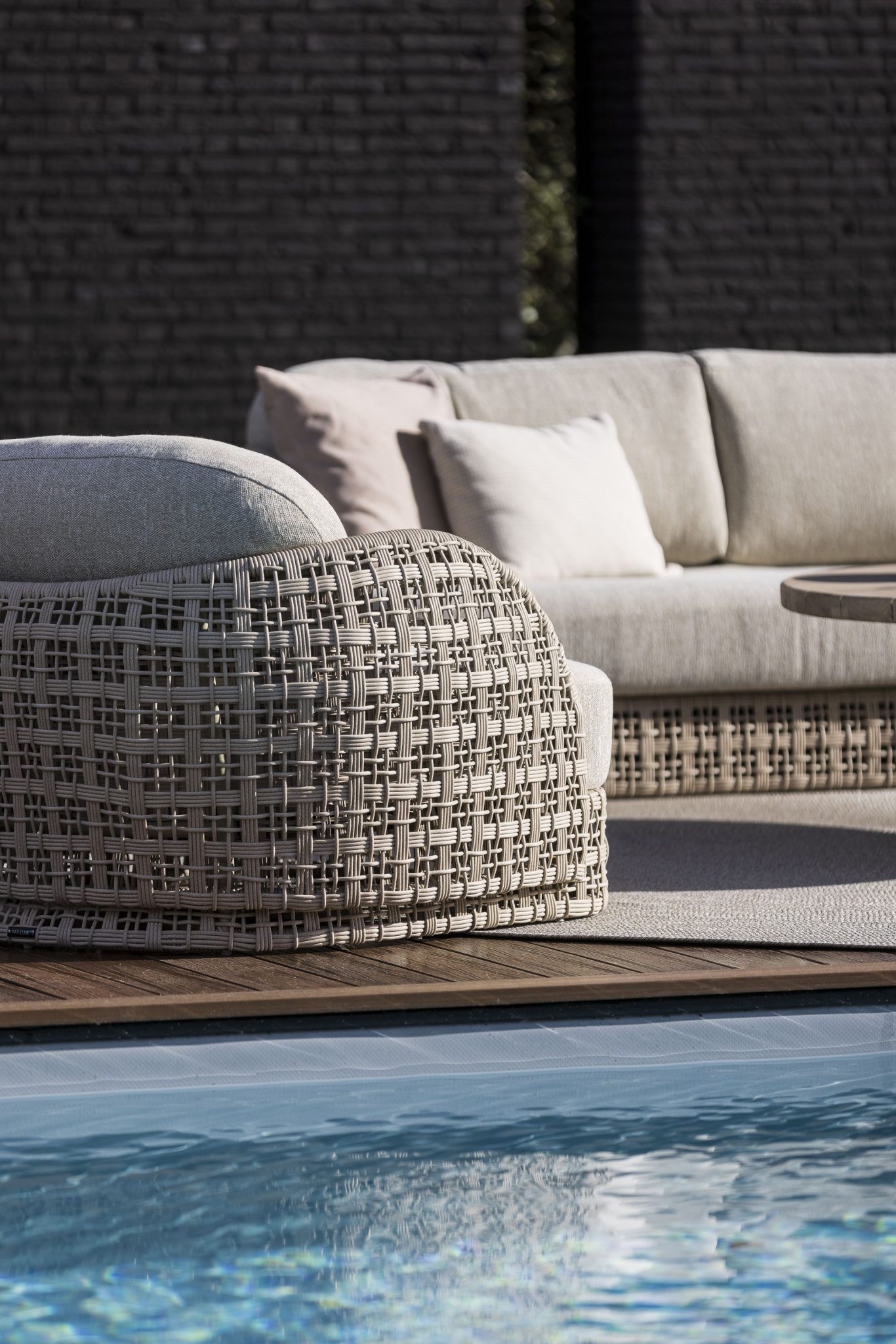 Orvieto brengt een nieuw gevoel van zachtheid naar de buitenruimte. De collectie, bestaande uit een lounge chair en sofa, kenmerkt zich door zachte, afgeronde vormen die meteen een rustige, uitnodigende sfeer creëren. Het fiber in de kleur White Shell heeft een open structuur die licht vangt en lucht doorlaat, waardoor de meubels licht en bijna zwevend lijken. Het moderne, grafische vlechtwerk voelt tegelijk warm en ambachtelijk aan.