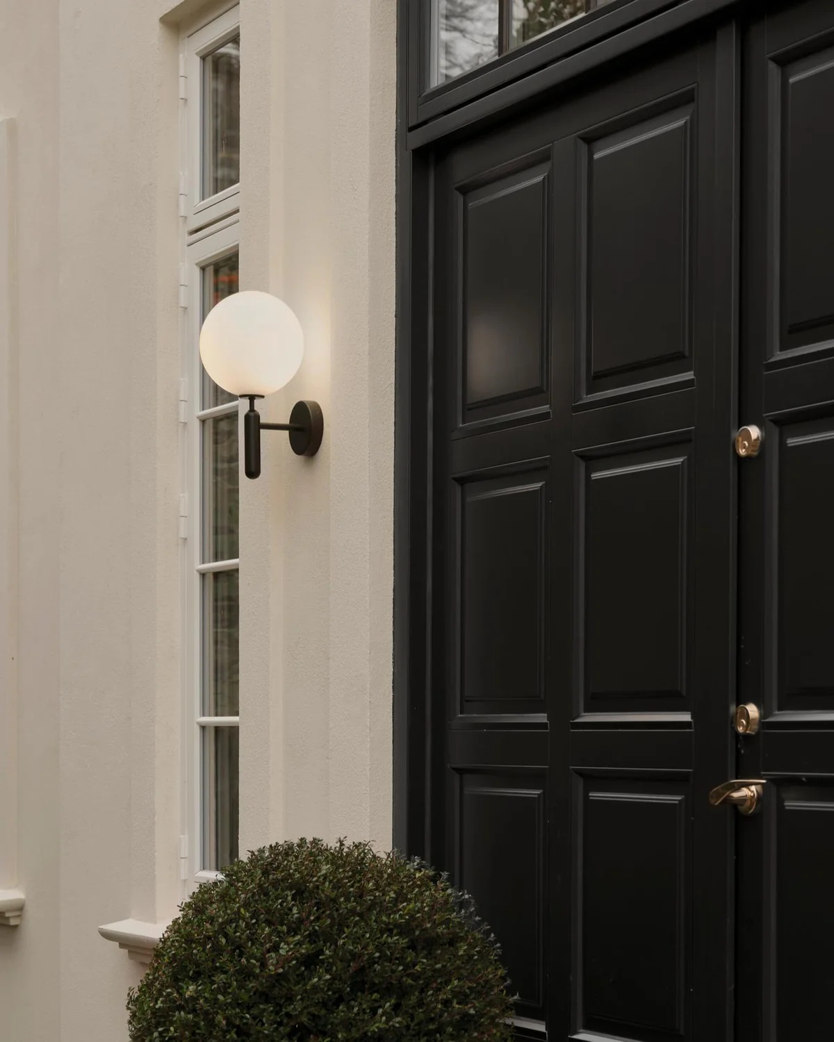 Miira Wall Outdoor is een buitenwandlamp die ontworpen is om buitenruimtes sfeervol te verlichten. De combinatie van metaal en een grote opaalglazen bol zorgt voor een eenvoudige, functionele uitstraling en een uitnodigende sfeer.
